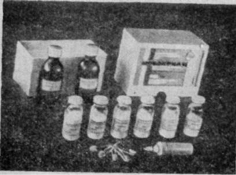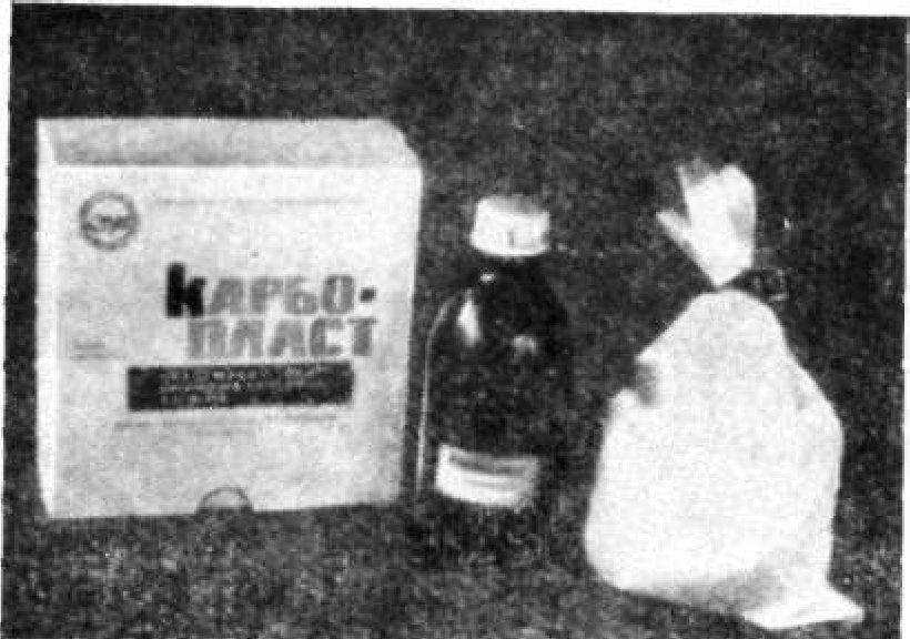 В заводской упаковке пластмассы протакрил содержится: порошок в полиэтиленовом мешочке—160 г, жидкость во флаконе—100 г, разделительный лак во флаконе — 50 г и дихлорэтановый клей во флаконе — 40 г (рис. 35).