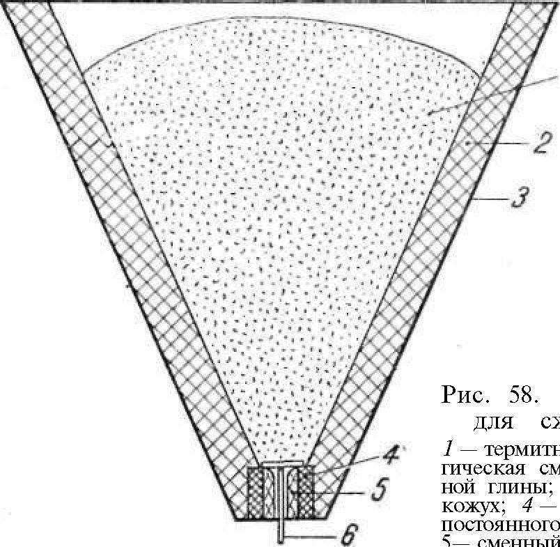 для сжигания термита. 1 — термитная смесь; 2 — металлургическая смесь магнезита и шамотной глины; .?—стальной конический кожух; 4 — запорное устройство из постоянного магнезитового стакана; 5— сменный штепсель; 6 — запорный гвоздь.