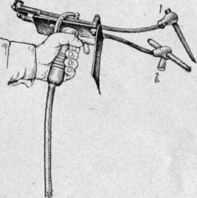 Рис. 60. Ручной плавильный аппарат с углеудерживающими (/ и 2) приспособлениями для получения вольтовой дуги.