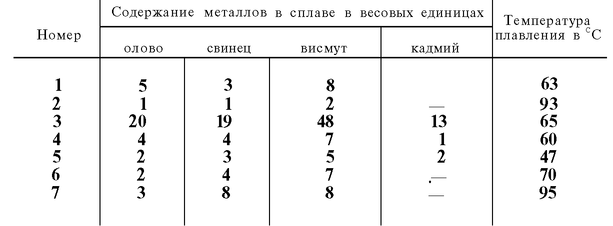 В практике зарекомендовали себя сплавы Вуда (№ 6) и сплав № 1, который называется сплавом Меллота.