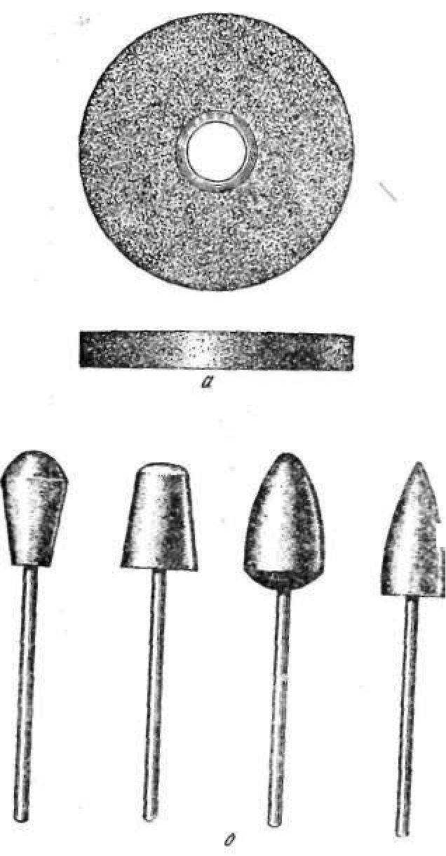 Рис. 73. Карборундовые камни для шлифмашины (а) и карборундовые фрезы (б).