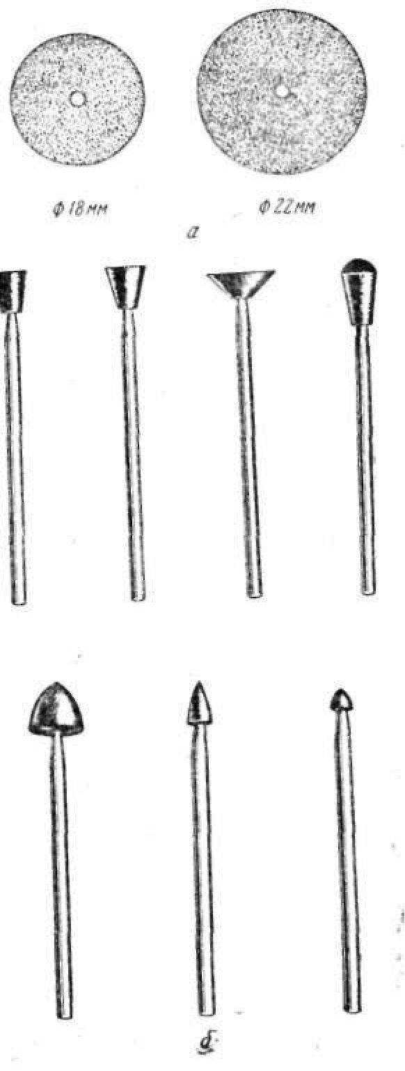 Рис. 74. Сепарацпонные диски (а) для бормашины и шлифовальные карборундовые фасонные головки (б).