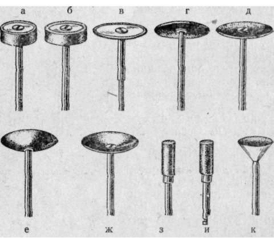 Рис. 75. Различные шлифовальные инструменты для обточки зубов (объяснение в тексте).
