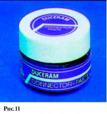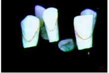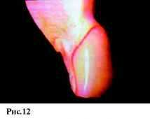 Программа обжига огнеупорного штампика ведется в следующем режиме: просушка при 575°С в течение 5 минут, скорость подъема температуры 55°С в минуту, конечная температура 1100°С, обжиг ведется без вакуума и конечная выдержка в течение 5 минут. Если количество штампиков больше пяти штук, то время выдержки при 1100°С увеличивается до 7 минут. После обжига штампик выглядит белоснежным. Затем граница препарации обводится огнеупорным маркером, входящим в набор «Ducera-Lay» (puc.10). После этого наносится тонким равномерным слоем, заходя за границы препарации, паста коннектор синего цвета. Обжиг проводится по следующей программе: температура просушки 620°С в течение 3 минут, скорость подъема 55°С в минуту, конечная температура 970°С, выдержка в течение 1 минуты, процесс обжига ведется в вакууме. После обжига штампик выглядит глазурованным в месте нанесения коннектор пасты (puc.11). Эта паста служит как мостик для соединения огнеупорного материала штампика и керамики, что впоследствии является гарантией точного отображения препарированной поверхности. Для продления срока службы коннектор пасты рекомендуется ее хранить в холодильнике. Следующий этап - изготовление основы винира из стандартной массы «Duceram». Смесь для первого обжига дентина должна соответствовать поставленной задаче: если культя окрашена, то получается ребристое смещение между успешным покрытием темных участков относительно непрозрачными массами (система CCS: ivory - слоновая кость + интенсивно белый) и сохранением прозрачности зуба. При толщине слоя 0,5 мм это трудно. На укороченных или отломившихся режущих краях опакерными массами заменяется только отсутствующий участок, чтобы имитировать натуральный дентин зуба. Это очень важный процесс, чтобы позднее, в зацементированном состоянии избежать светооптической линии разрыва. Самые красивые и лучшие результаты достигаются с помощью целенаправленного наслоения и формообразования базиса винира. Он должен иметь толщину 0,3 мм. Для достижения естественного эффекта воспроизводятся все значимые в отношении цвета особенности естественного зуба - структура мамелонов, возможные светлые зоны или интенсивные по цвету. В виду малой толщины винира может наблюдаться просвечивание зубной культи. Кроме случаев с окрашенной культей, это является желательным эффектом. Поэтому очень важно определить не только цвет для винира, но и цвет культи зуба.