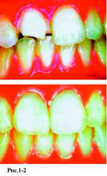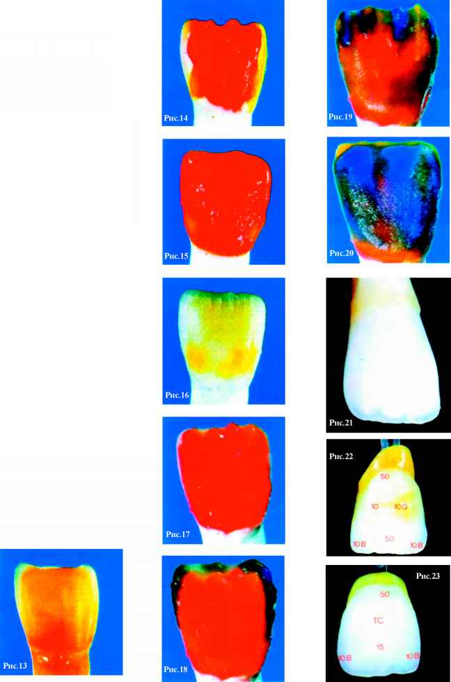 масс LFC. Базисная фасетка просто переносится на контрольную модель. Для фиксации фасетки на гипсовом штампике во время последующих этапов нанесения слоев подходит специальный клей (адгезив для штампиков фирмы «Ducera»), сгорающий без остатков при температуре обжига 660°С. Зарубежные результаты наблюдений последних лет за протезами из LFC показали, что экстремально однородная и плотная керамика особенно хороша в гинги-вальной области, обеспечивая великолепные клинические результаты. Другое преимущество - абразия гидротермальной керамики очень близка к абразии естественной зубной эмали (профессор Б. Ланг, Мичиганский университет, США). Особенно стоит упомянуть самовосстановление гидротермальной керамики путем образования слоя гидроксила кремния Si-OH на ее поверхности. Благодаря слою гидроксила кремния на длительное время исключаются и закрываются микродефекты керамики. При применении эмалевых и опаловых масс LFC свет без препятствий проходит сквозь низкотемпературные массы. Благодаря разнородной структуре с находящейся внизу тугоплавкой керамикой свет рассеивается затем во все стороны. Из-за такого рассеивания получается отличный естественный вид реставрации, как у натурального зуба. Применяя опалесцирующие массы для эмали этот эффект можно усилить еще больше. На основание винира наносятся эмалевые массы LFC, располагающиеся вертикально друг с другом по режущему краю. В данном случае надо следовать естественному образцу: синевато-опаловые в режуще-аппроксимальной области, опа-лесцирующие цвета янтаря - в центре зуба (особенно красиво для режущих краев зубов пожилых пациентов), светлые зоны - с помощью опала № 50. В качестве несущей массы можно использовать и прозрачную массу ТС, подкрасив ее соответствующими эффектными массами. Важно, что данная техника нанесения слоев дает естественный вид. Опаловые массы LFC отличаются тем, что не утрачивают своего опалового эффекта и при многих обжигах. Важно! Скорость подъема температуры 55°С/мин. ни при каком обжиге LFC не должна превышаться. Как правило, одним - максимум двумя обжигами вся работа по формированию и цвету заканчивается. Но и здесь также действует правило: «упражнение делает мастера». С помощью целенаправленного структурирования поверхности и возникающих с помощью этого отражений света можно еще более приблизиться к естественности. Режим глянцевого обжига: 650°С/90 сек. без вакуума. Разумеется, полировку поверхности можно проводить вручную. Тонкозернистые резинки, фетровые кружки в сочетании с алмазной пастой очень хорошо подходят для этой цели. Рассмотрим конкретный пример изменения цвета зуба с помощью винира. Имеется темноокрашенный зуб цвета А4, препарированный под винир (рис.13). Используя описанную выше технологию, изменим цвет на В2. На фотографиях керамическая масса прокрашена органическими красителями для большей наглядности. Основа винира делается из белого опа-кизированного дентина, состоящего на 50% В2 и 50% В1 плюс 20% состава CCS, изготовленного из CCS N 19 цвета слоновой кости (Ivory) и N 20 цвета банана (Banana) (рис.14). Аппроксимальные и инцизиальные свободные пространства домоделируются белым опакизированным материалом для режущего края (рис.15). Обожженная тонкая белая базисная оболочка. В центральной выпуклой области внесены опакизи-рованные цветовые частицы (рис.16