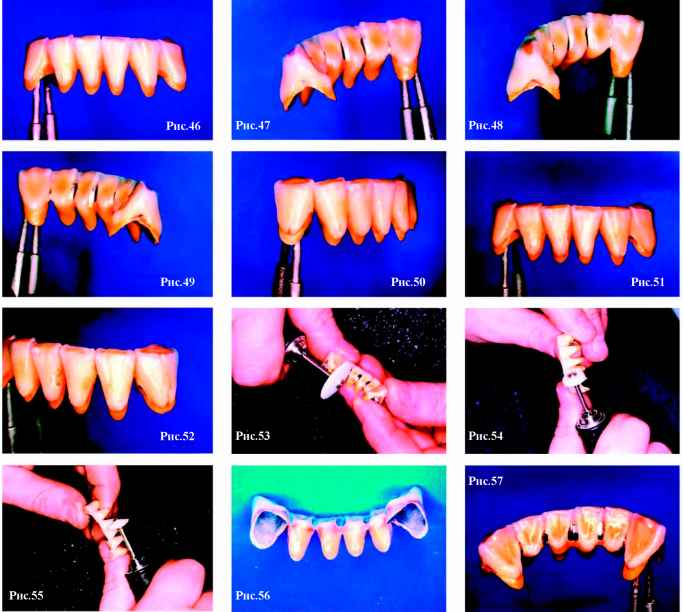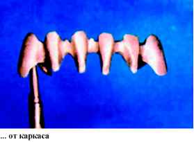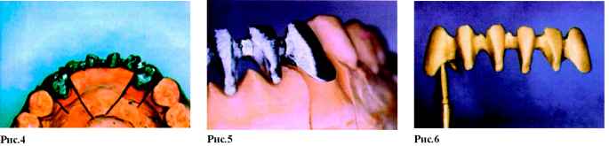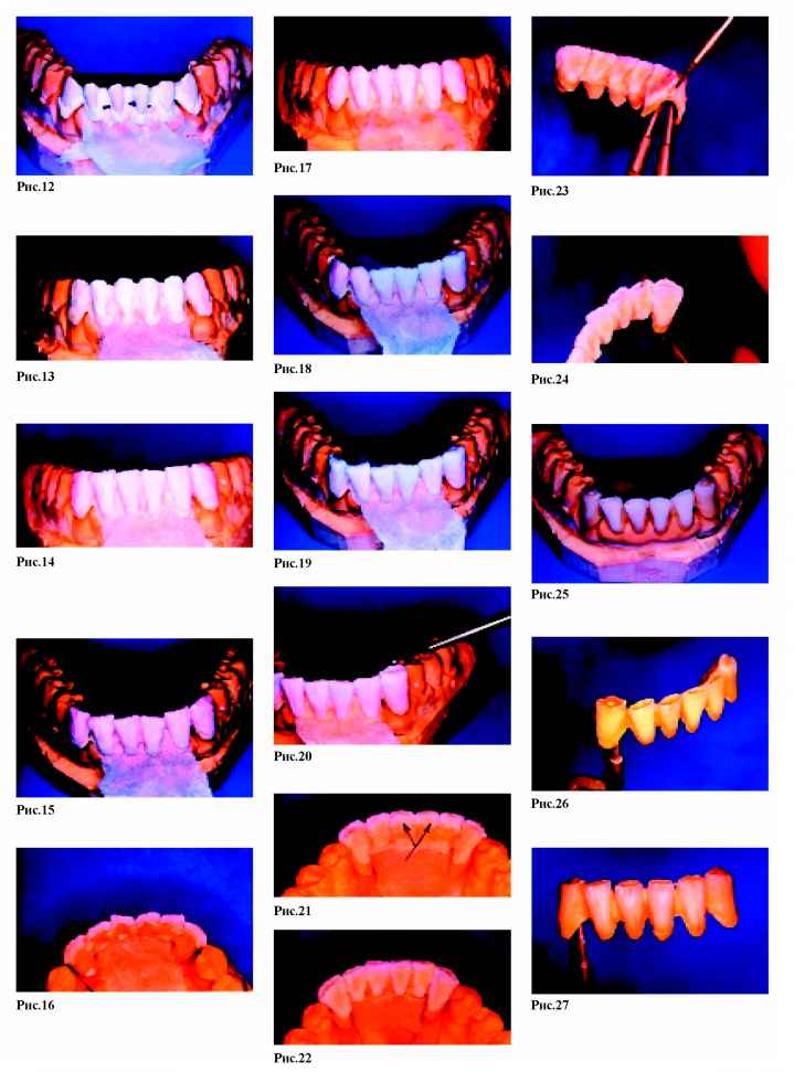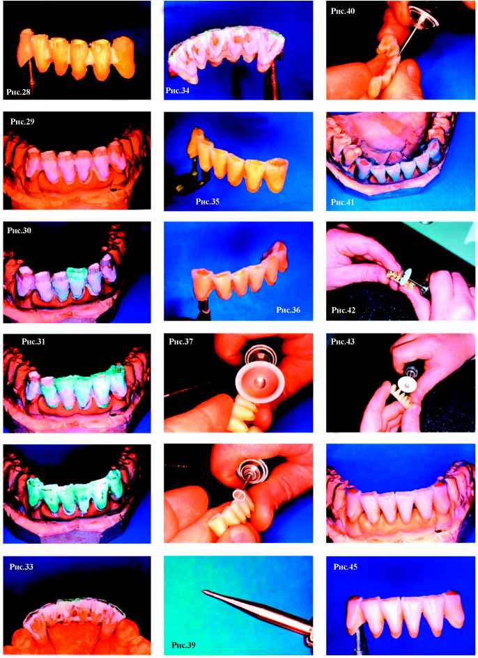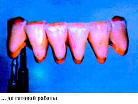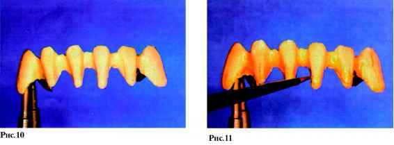 Среди их достоинств- точное изохроматическое воспроизведение цвета, прочность, долговечность, биосовместимость. История применения фарфора в стоматологии уходит корнями в конец XIX века, и, вплоть до изобретения пластмассы, фарфор был единственным эстетически приемлемым материалом для протезов. Однако, даже сегодня, при большом разнообразии композиционных материалов, применяемых в эстетическом протезировании, керамика чаще всего является предметом выбора. С применением керамики изготавливают микропротезы (вкладки inlay, onlay, overlay, veneer-коронки), цельно-керамические протезы! системы Hi-Ceram, In-Ceram, Celay-sistem, Imprees-ceramic, Procera) и широко распространенную сегодня металло-керамику, которая незаменима при изготовлении мостовидных протезов большой протяженности. Но в каждом случае, при изготовлении протезов с использованием керамических (или иных облицовочных) материалов, эстетический подход к процессу изготовления имеет очень важное значение. Высококвалифицированные зубные техники не могут быть удовлетворены своей работой, если искусственные зубы легко отличаются от натуральных («протез» - от греческого - искусственная замена). Только высочайшие требования к себе и работе врача, а также к проведению подготовительных работ (например: ортодонтическое и хирургическое лечение) могут привести к желаемым результатам. В данной статье мы последовательно, шаг за шагом, постараемся детально показать технику изготовления мостовидно-го металлокерамического протеза, основанную на одном из методов эстетического подхода к протезированию.Хотелось бы отметить, что данный способ выражения художественных амбиций зубного техника не следует принимать как образец, как стандартное изготовление зубных протезов. Здесь акцент делается на индивидуальность работы, на демонстрацию возможности мастера, используя современные керамические материалы .достигать практически любого результата. На рис. 1 (стр.11) изображены натуральные зубы нижней челюсти с очень интересным морфологическим строением. Естественная скученность зубов, структура поверхности и структура режущего края сразу обращают на себя внимание. Апроксимальные стороны, позиция режущих краев, анатомический контур шейки зуба - вот минимум признаков, которые подчеркивают натуральность, естественность зубов и зубного ряда. Все эти индивидуальные и возрастные особенности должен уметь воспроизводить зубной техник, так как перед ним стоит очень сложная задача: он должен «обмануть» окружающих и выдать свою копию (зубной протез) за оригинал. А если в работе отсутствуют или, наоборот, излишне выделены характерные особенности морфологического строения и цветопередачи, то это быстро ведет к распознаванию подделки. Главным в изготовлении металлокера-мических коронок и мостовидных протезов являются следующи е этапы: определение формы, создание поверхности, постепенное достижение цвета. Успех каждого протезирования в значительной мере зависит от этих факторов. Уже на этапе моделирования каркаса зубной техник должен представлять себе окончательные контуры будущего протеза, поэтому необходимо учитывать нюансы, положительно влияющие на конечный результат. Для того, чтобы работа выглядела натуральной, естественной необходимо создать иллюзию отдельно стоящих зубов, поэтому при восковом моделиро
