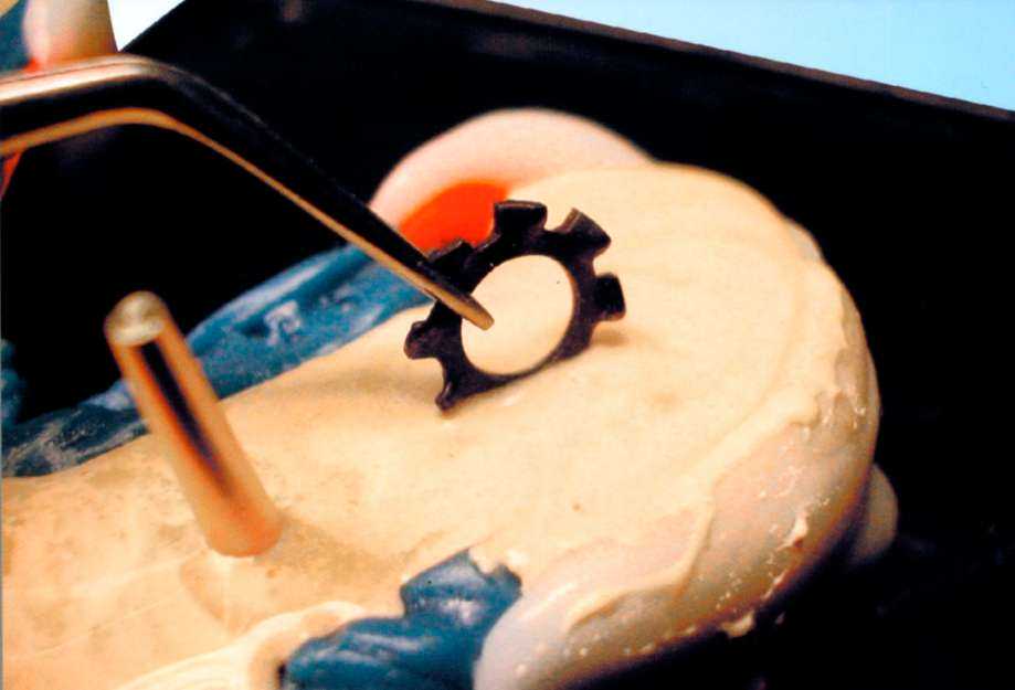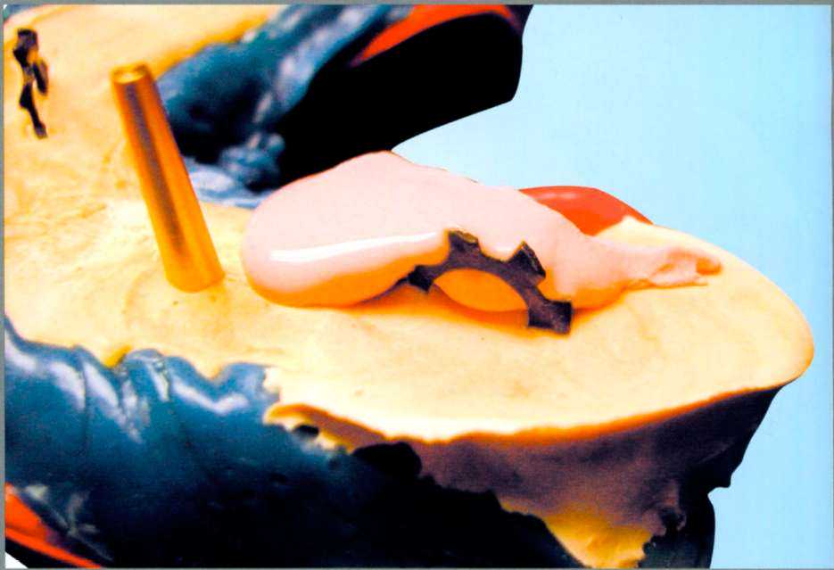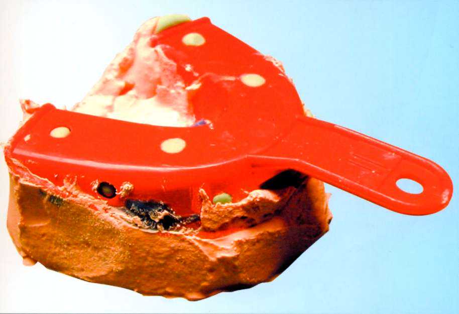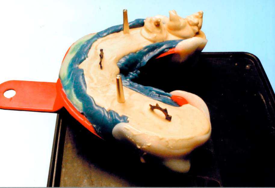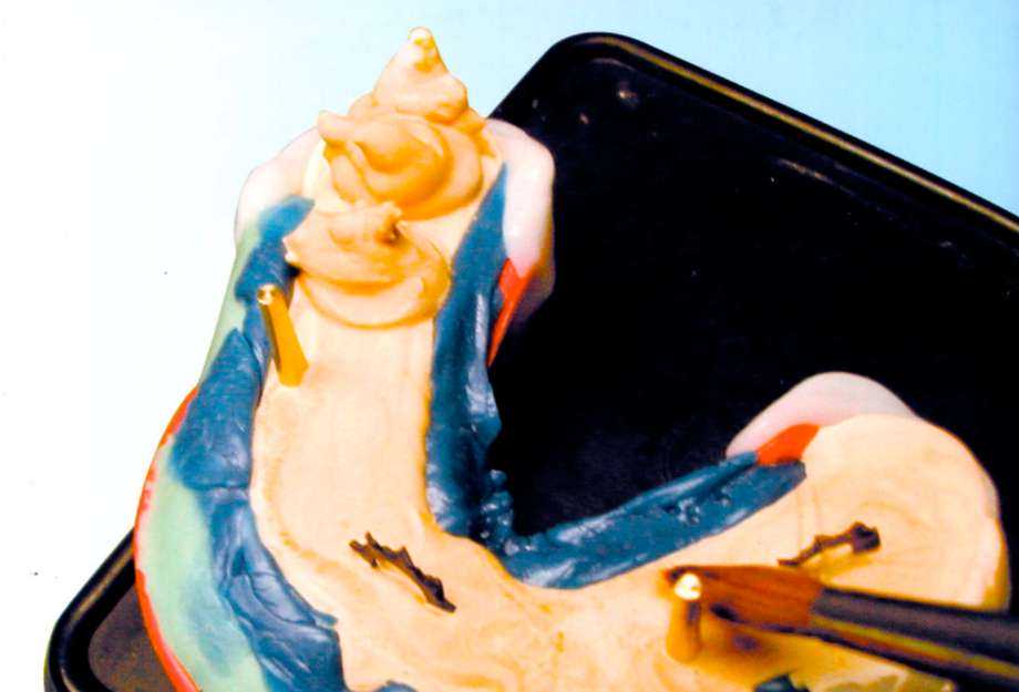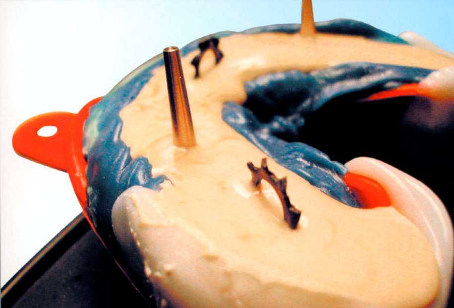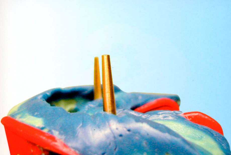 ...и если штифты будут одинаковы по высоте,... ...то не будет трудностей с нахождением их в основании цоколя модели. II этап — получение гипсовой модели