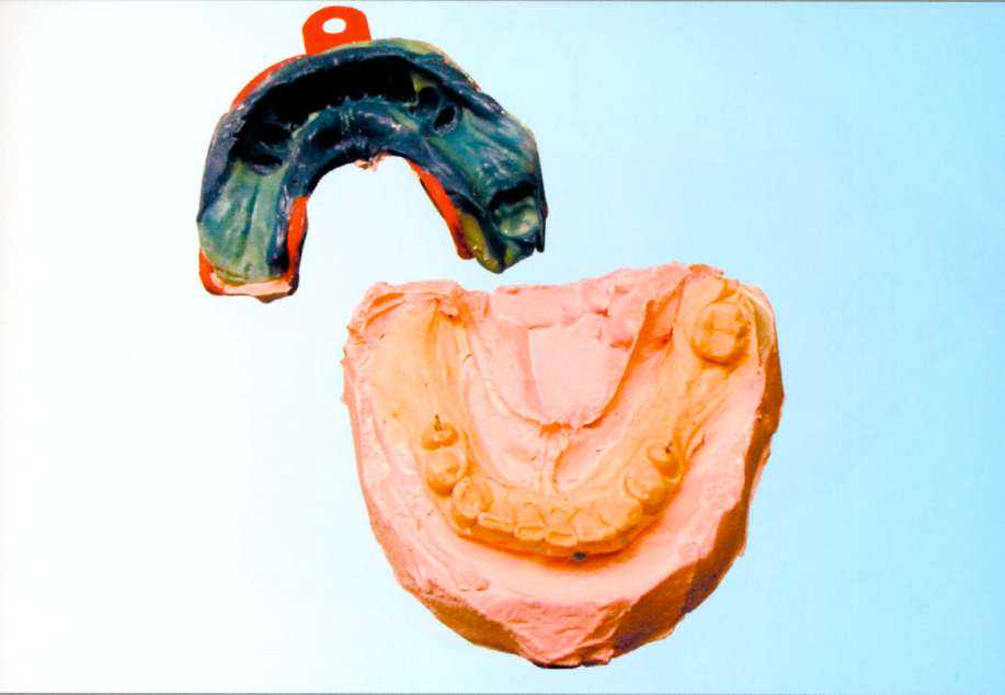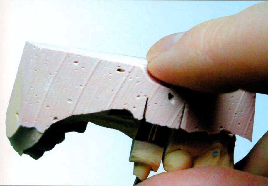Отделяем от цоколя модель зубного ряда. Диском с алмазным покрытием распиливаем модель на сегменты. Распилы должны быть параллельны. При использовании пиндекссистемы мы получаем разборную модель, из цоколя которой можно извлекать не только штампики препарированных зубов, но и фрагменты всего зубного ряда. ИЗГОТОВЛЕНИЕ МОДЕЛИ БЕСШТИФТОВЫМ МЕТОДОМ Подготавливаем пластмассовую форму, обрабатывая ее изолирующим от гипса спреем. Замешанным гипсом IV класса заполняем пластмассовую форму, а затем — оттиск. Соединяем заполненные гипсом поверхности. Оставляем их до полного отверждения гипса. Снимаем оттискную ложку с оттиском и получаем готовую модель. При данном методе нет необходимости использовать два типа гипса и триммер, соответственно, экономится материал и время.