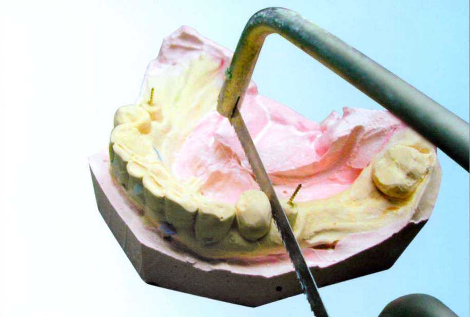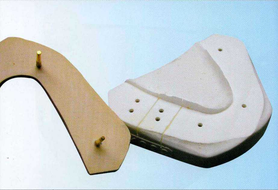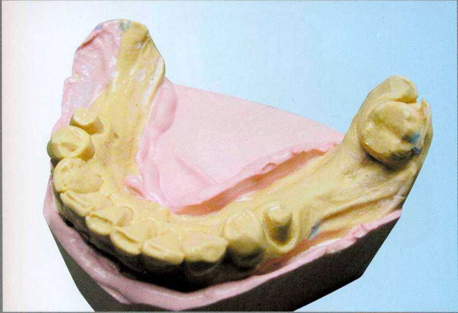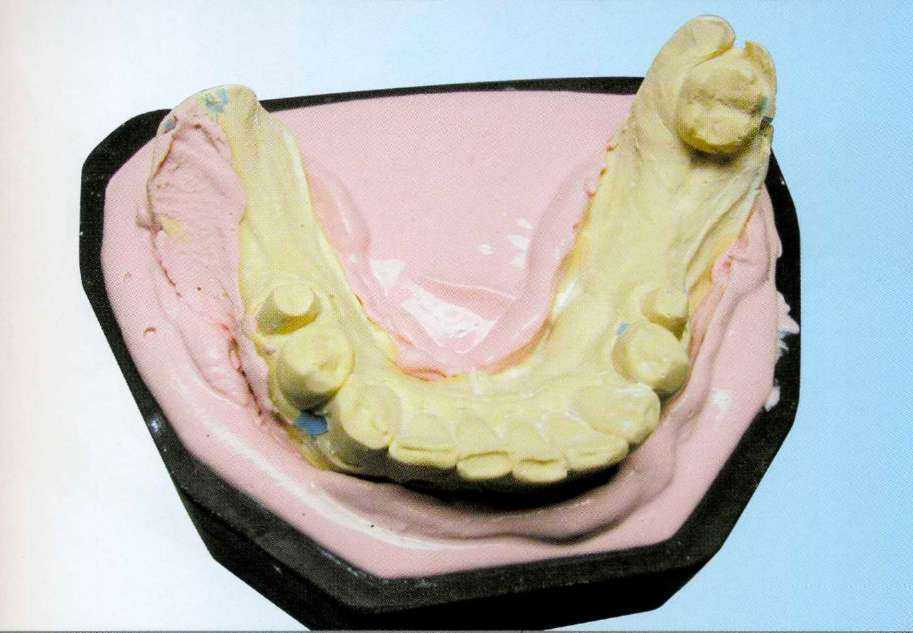 К началу фазы «схватывания» гипса в области промежуточных и концевых участков модели устанавливаем специальные ретенционные приспособления для последующей фиксации несъемных сегментов в цоколе модели. Ретенционные пункты можно создать с помощью гипса. После отвердевания гипса IV класса наносим на его поверхность, в области штифтов, изолирующую жидкость для разделения гипса IV класса от гипса III класса (цокольного) и дальнейшего легкого извлечения штампика из модели (после ее распиливания). Далее замешиваем гипс III класса, постепенно заливаем его на ранее заполненный гипсом IV класса оттиск и формируем цоколь модели. Когда гипс отвердел, необходимо аккуратно снять оттиск с готовой модели.