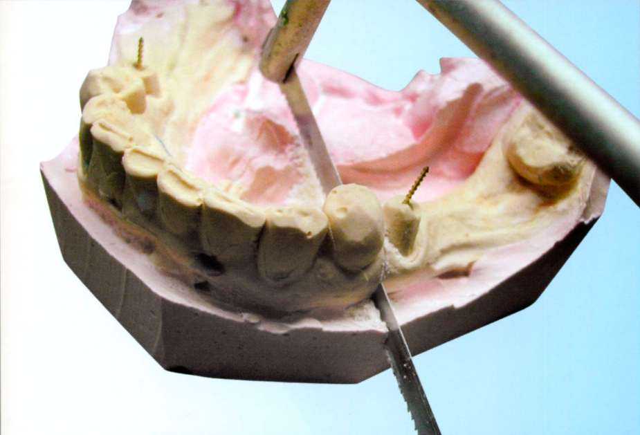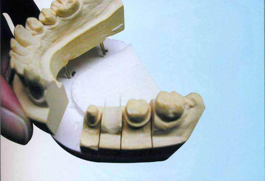 не увлажняется и не происходит ее объемной деформации при высыхании. После использования триммера с подключением воды модель необходимо просушить. III этап — распиливание гипсовой модели на сегменты При работе лобзиком делаем параллельные распилы гипса IV класса до касания лобзика гипса III класса. Распилы модели на сегменты должны быть обязательно параллельны. Если это правило не выполняется, то сегмент невозможно будет вынуть из модели. На основании модели частично освобождаем штифты от гипса,...