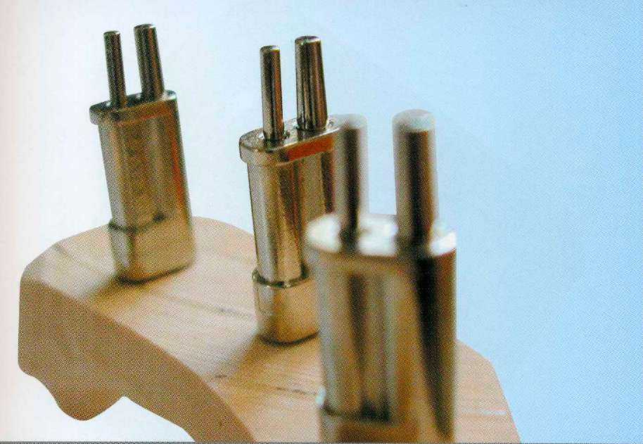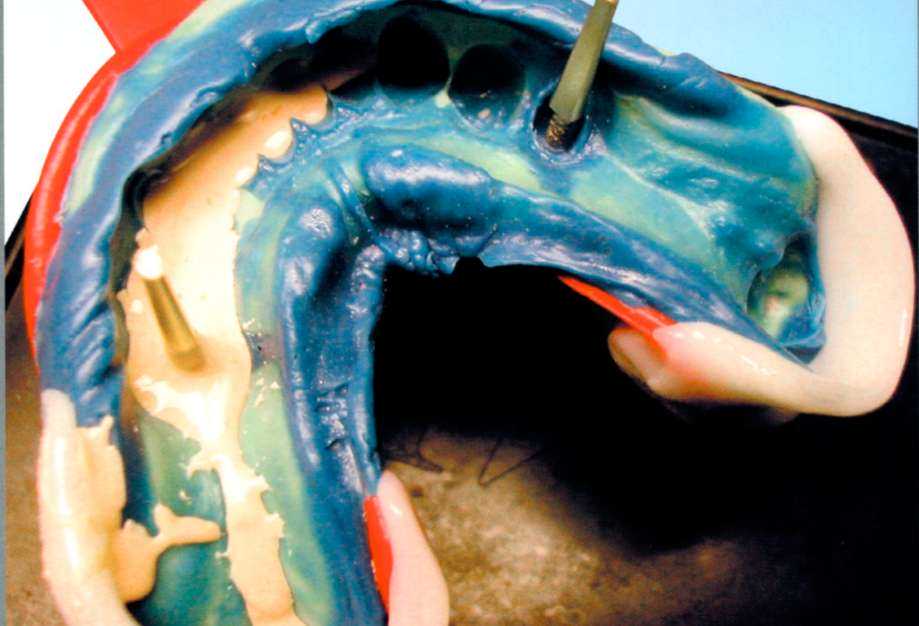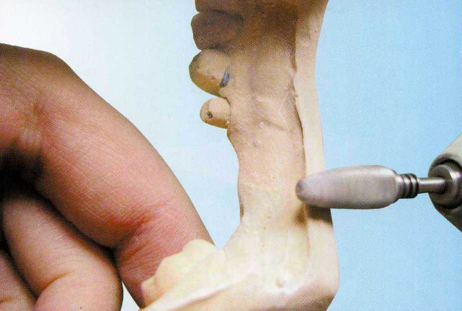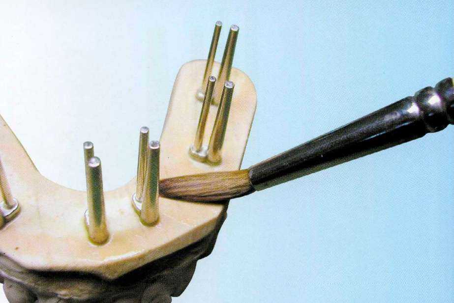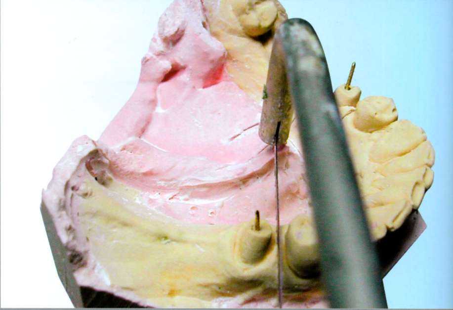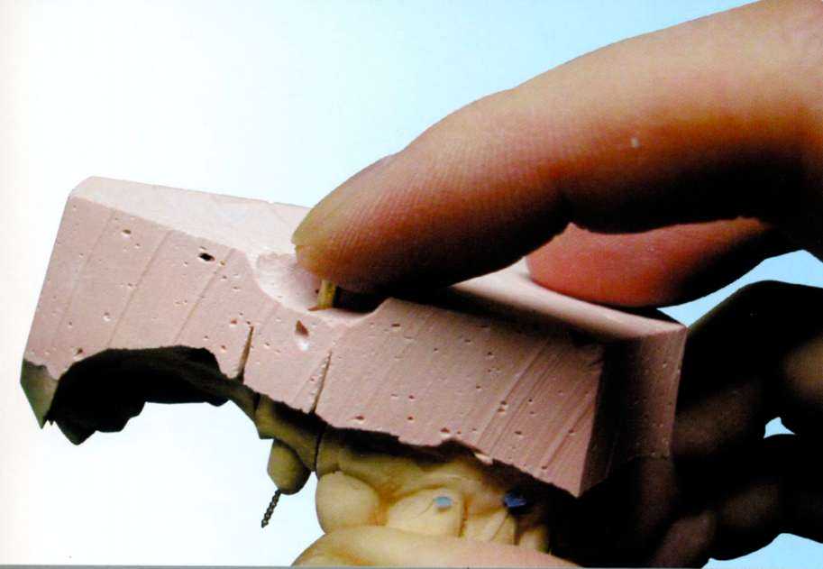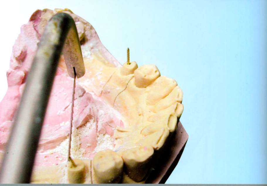 I этап — установка штифтов Первый этап изготовления разборной модели — установка штифтов, например, игольчатых с фиксацией в области препаровки _