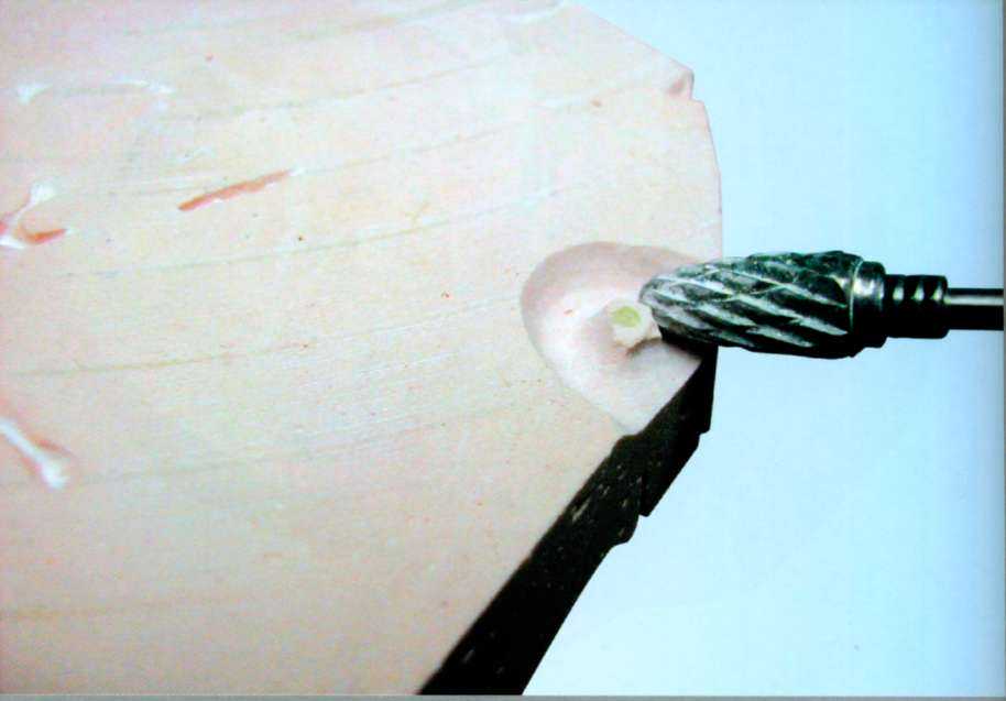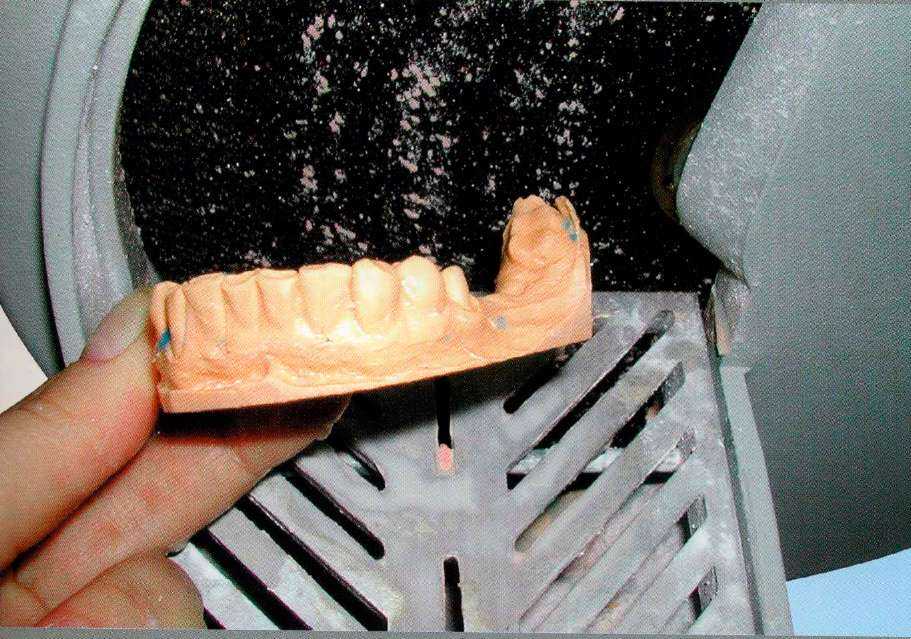 Если использовался триммер с влажной обработкой модели (подключенный к воде), то модель должна быть просушена, а затем специальной фрезой для обработки гипса оформляем внутреннй контур модели. _ Используя автоматический прибор для сверления параллельных отверстий под штифты с лазерным указателем и регулировкой глубины сверления (пиндексмашины, пиндекс-системы), подготавливаем модель к установке штифтов (пинов).