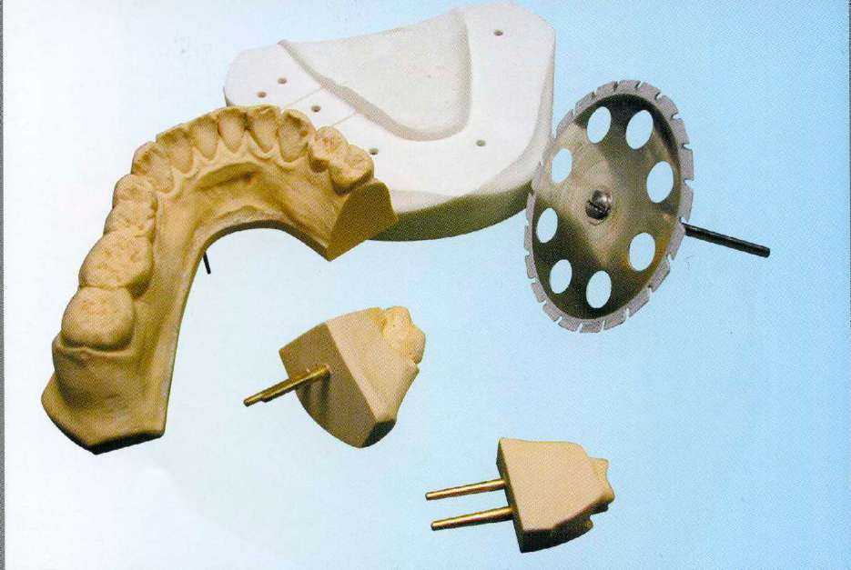 При бесштифтовом методе нет необходимости использовать два типа гипса, что экономит время и материалы. С помощью производимых разными фирмами комплектов пластмассовых форм, обеспечивается точное и прочное положение элементов разборной модели и надежная фиксация модели в артикуляторе. • Модель — это образец для изготовления какого-либо изделия, точно воспроизводящий форму последнего. • Модель челюсти — это точная репродукция поверхности твердых и мягких тканей, расположенных на протезном ложе и его границах. • Штифты для изготовления гипсовой разборной модели различаются: A. по конструкции и форме рабочей части: - с цоколем плоским (предотвращают перекручивание штифта) или игольчатым (для фиксации в оттиске в области препаровки зубов); - с ретенциями — насечками — и канавками, обеспечивающими лучшую фиксацию в оттискном материале; - штекерной формы — уплощенные участки предотвращают перекручивание штифта и облегчают отделение или срезку штифта после окончательного изготовления штампика; Б. по конструкции и форме направляющей части: - с цилиндрической или конической (облегчает посадку и изъятие штампика из цоколя модели) направляющей частью; - с одинарной или двойной направляющей [с одной или двумя направляющими (в том числе с длинной иглой для фиксации в крае оттиска) ]; - с длинной иглой для фиксации в крае оттиска; B. по размеру (длине, ширине, диаметру). • Гипс по твердости разделяют на 5 классов (ISO): I — мягкий — используется для получения оттисков; II — обычный — используется для наложения фиксирующих повязок; III— твердый — используется для изготовления диагностических моделей в технологии съемного протезирования, а также для изготовления цоколя разборной модели в технике несъемного протезирования; IV — сверхтвердый — используется для изготовления разборной модели; V — особотвердый (синтетический) — используется для изготовления точных моделей. • Гипсовую модель можно распиливать с помощью: - специального лобзика и пилок разного размера, толщины, длины; - зуботехнического мотора и отрезных дисков с алмазным покрытием (диски различаются диаметром, толщиной, перфорацией и выбираются в зависимости от вида модели); - специального прибора для распиливания модели на сегменты — сверлильно-разрезного аппарата. |