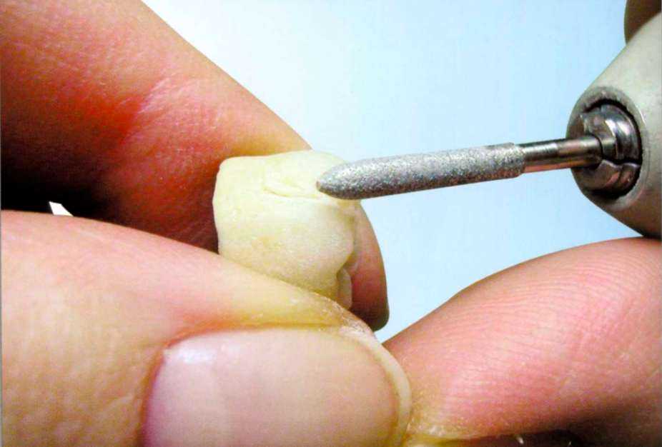 Полировальными силиконовыми и алмазными инструментами создается микрорельеф зуба, после глазуровочного обжига корректируется точность посадки керамики в области краевого прилегания.