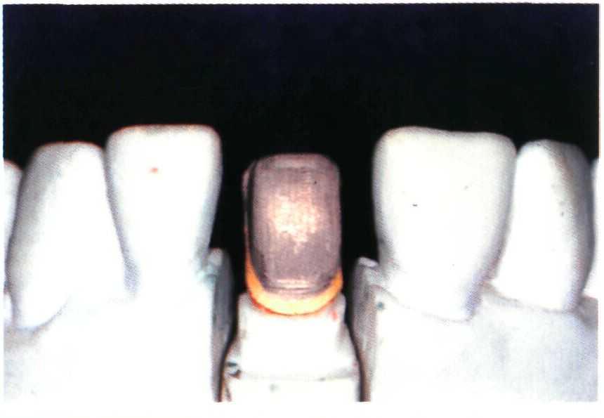Рис. 65b. Вид коронки со стороны вести булярной поверхности; нанесен тонкий слой голубой эффект-массы.