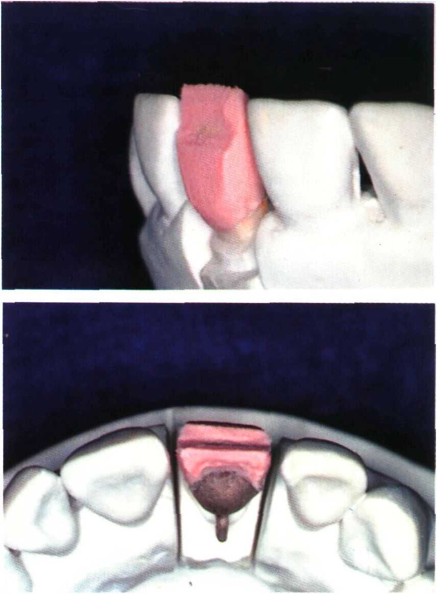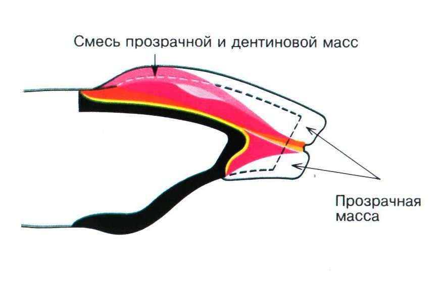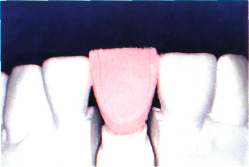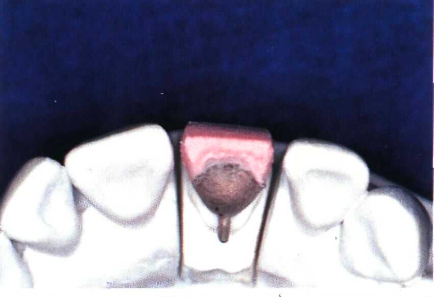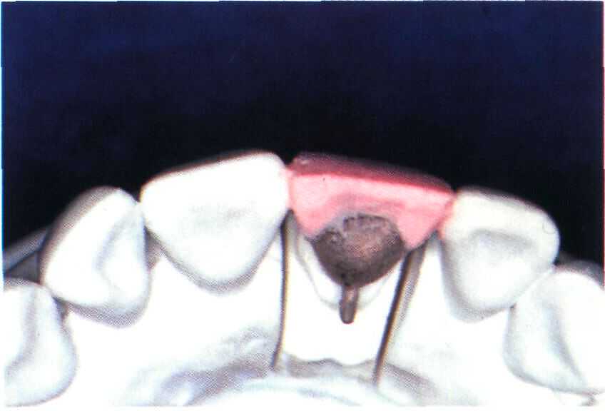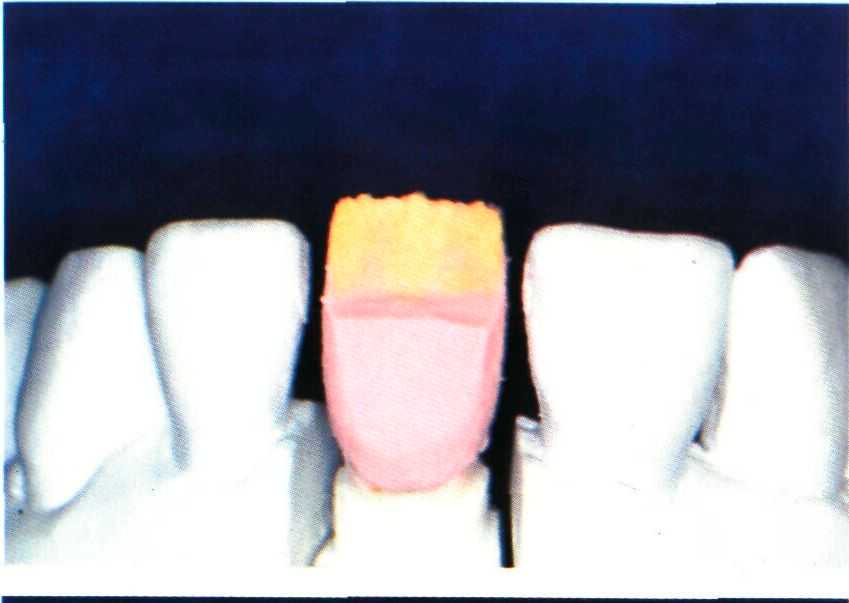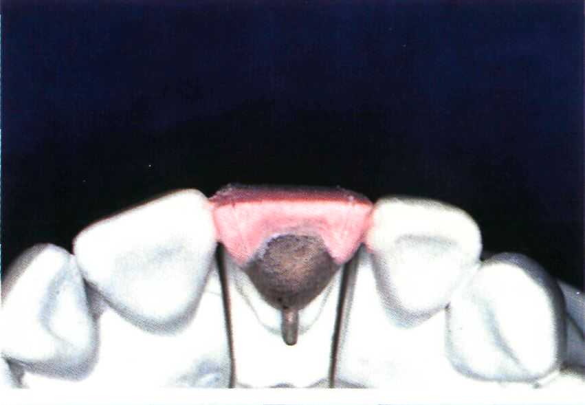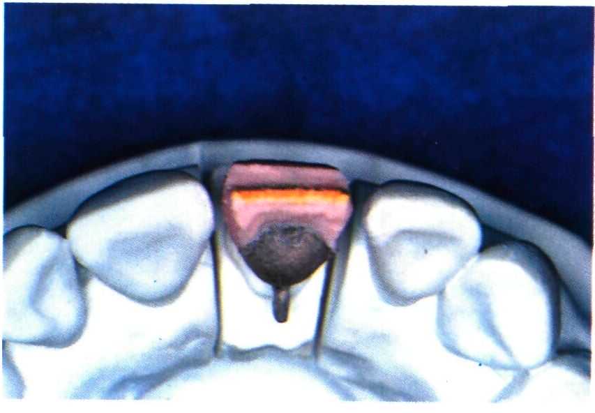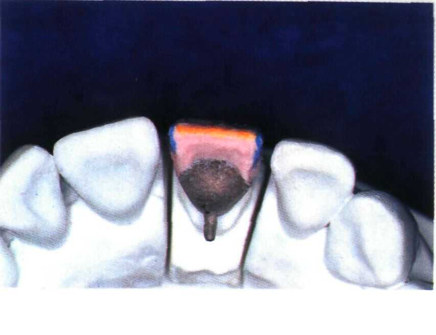 Рис. 58b. Нанесенная дентиновая масса.Так как в области режущего края готовойкоронки дентин должен быть оголен дляимитации стирания, коронку формируют на1,0-1,5 мм длиннее зуба-антагониста. • Дентиновая масса: Vintage АдВ.