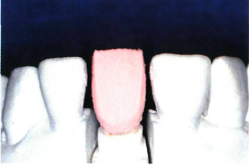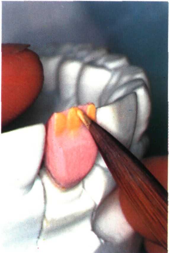 Рис. 57с. Нанесение пришеечной эффектмассы для имитации прикорневой зоныкоронки.