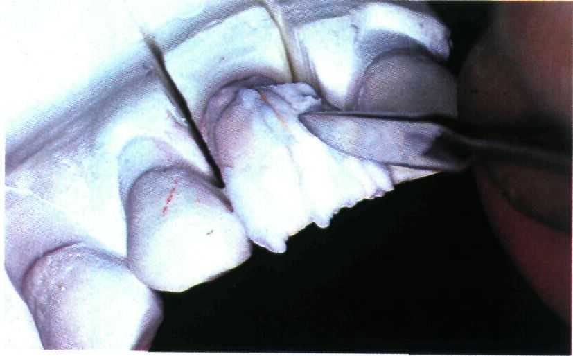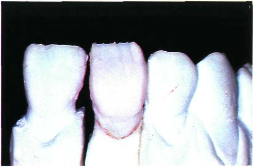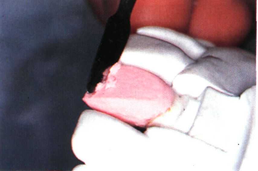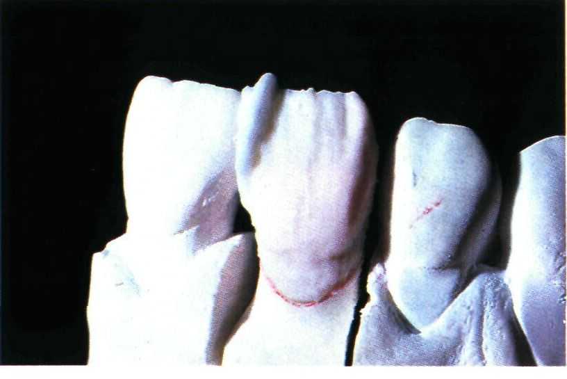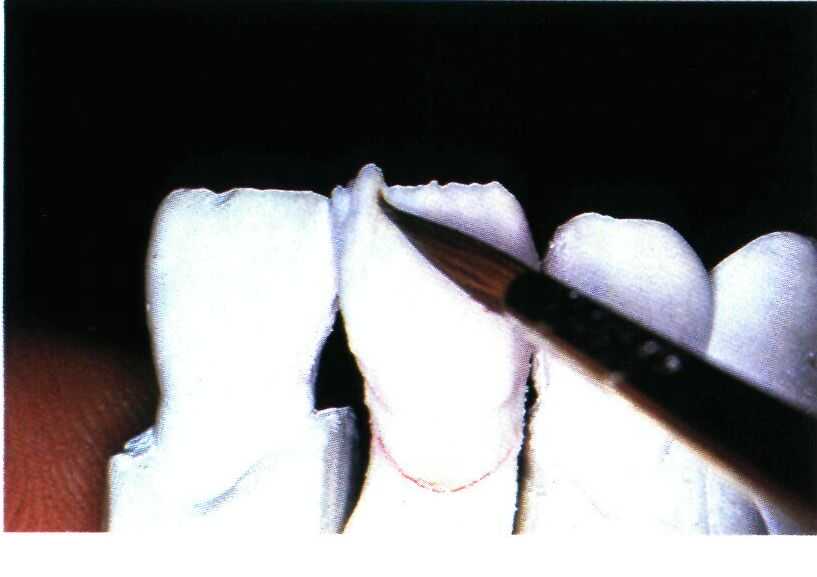 Для имитации высокой прозрачности керамического покрытия еготолщина в режущей части коронки должнасоставлять 1,2-1,3 мм. Рис. 59b. Срезание массы с вестибулярной поверхности коронки. Для имитацииобщей прозрачности срезание выполняютсравнительно ровно по всей вестибулярной поверхности соответственно эмалевоцементной границе, ориентируясь по линиям разметки.