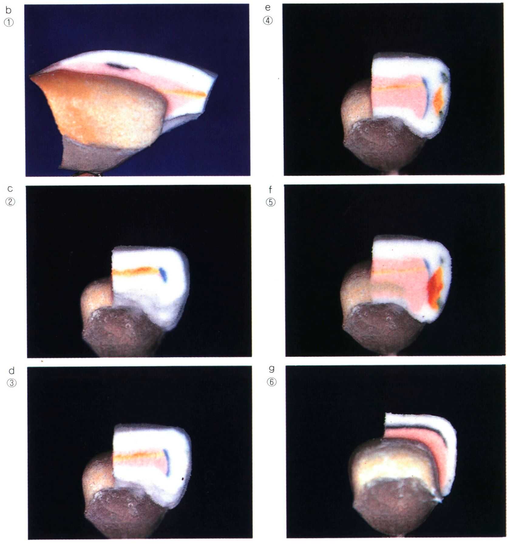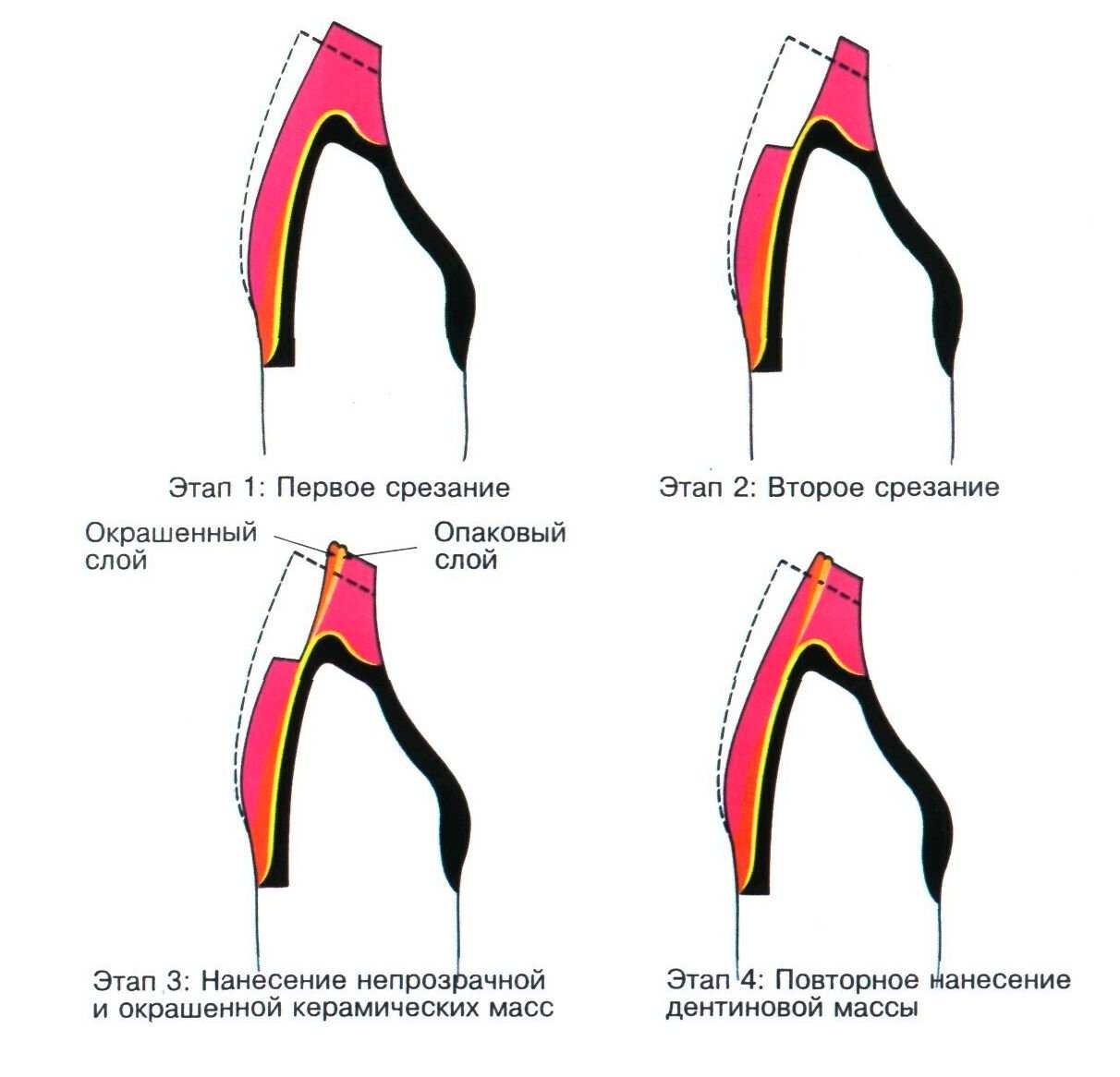 Показана имитация толстого желтого непрозрачного слоя - результата стирания зуба в области режущего края, а также имитация образования плотного непрозрачного дентина, толстого голубого прозрачного слоя в проксимальной области, темных полосок и различных пятен, обычно встречающихся у зубов пожилыхлюдей. |