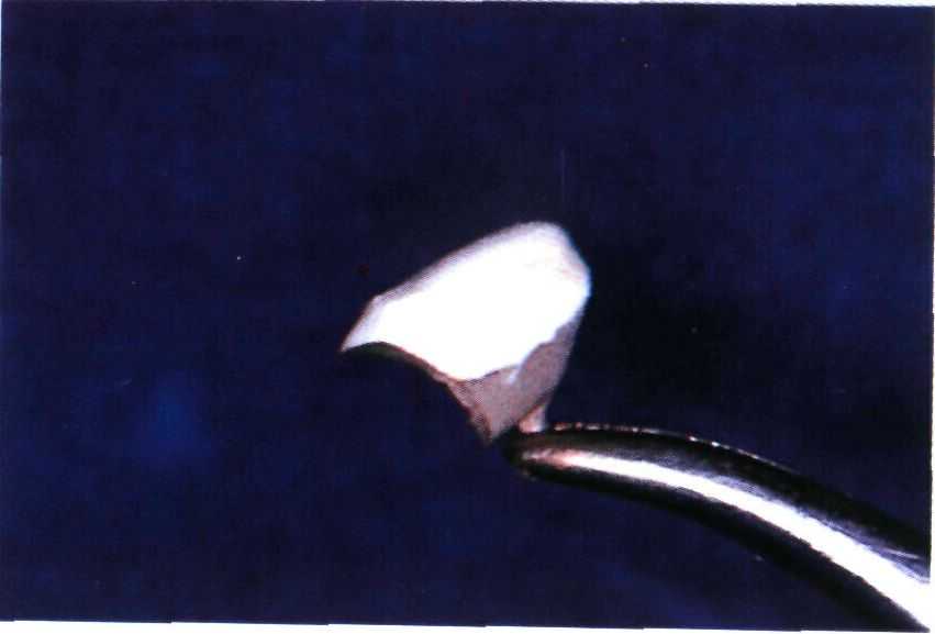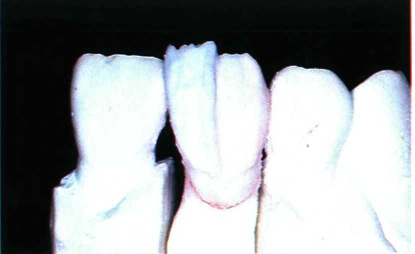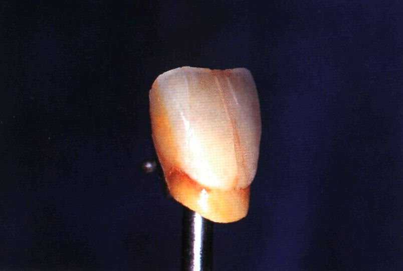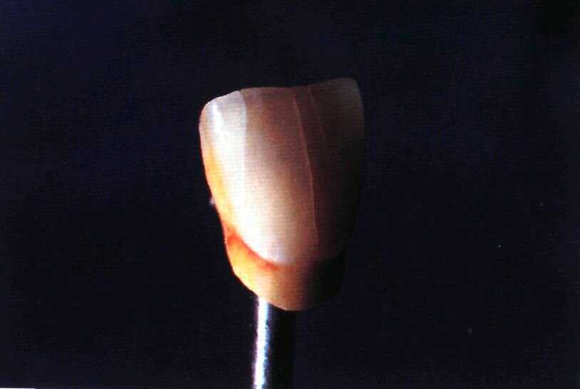 Рис. 69b. Вид коронки после срезания язычной поверхности. Обратите внимание, что в области режущего края все еще при сутствуют непрозрачный и окрашенный слои.