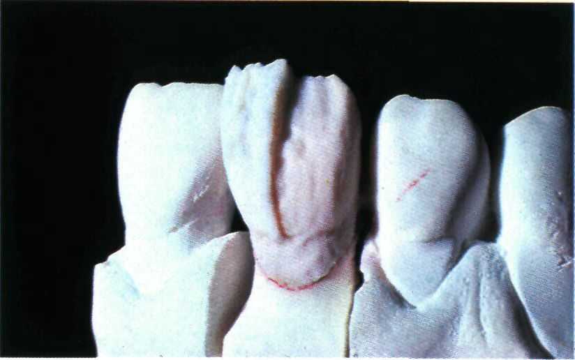 Рис. 59d. Вид коронки со стороны вестибулярной поверхности; разметка линийсрезания массы в проксимальной области. Эти линии наносят на срезанной вестибулярной поверхности коронки на расстоянии приблизительно 1 мм от проксимальной зоны с постепенным сужением к шейке зуба.