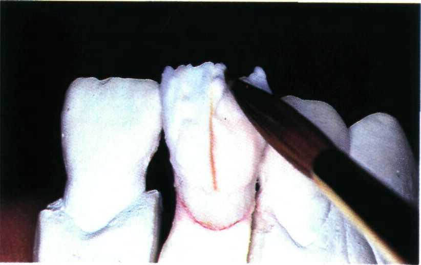 Рис. 67с. Смешайте краситель со специ альной жидкостью и нанесите его одним слоем, предварительно проконденсируя коронку. Краситель наносится одним маз ком и только тогда, когда на поверхности керамического покрытия появится влага. Не рекомендуется повторно наносить кра ситель, так как имитируемая трещина мо жет получиться жирной и размытой.
