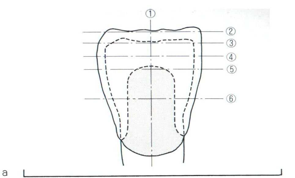 Рис. 59е. Вид коронки со стороны режущего края; обратите внимание на разметкулиний срезания массы в проксимальнойзоне. Рис. 59f. Вид коронки со стороны вестибулярной поверхности; показаны контурыдентиновой массы после ее первого срезания.