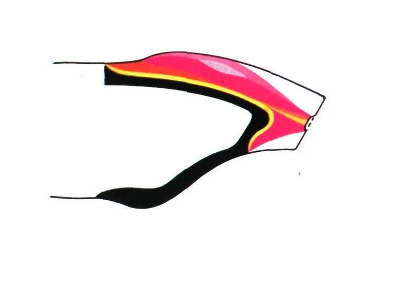 Рис. 69с. На срезанную язычную поверх ность коронки наносится прозрачная или эмалевая масса. Рис. 70. Поперечный срез коронки после нанесения прозрачной массы и коррекции язычной поверхности. Сравните эту схему с поперечными срезами, представленными на рис.71.