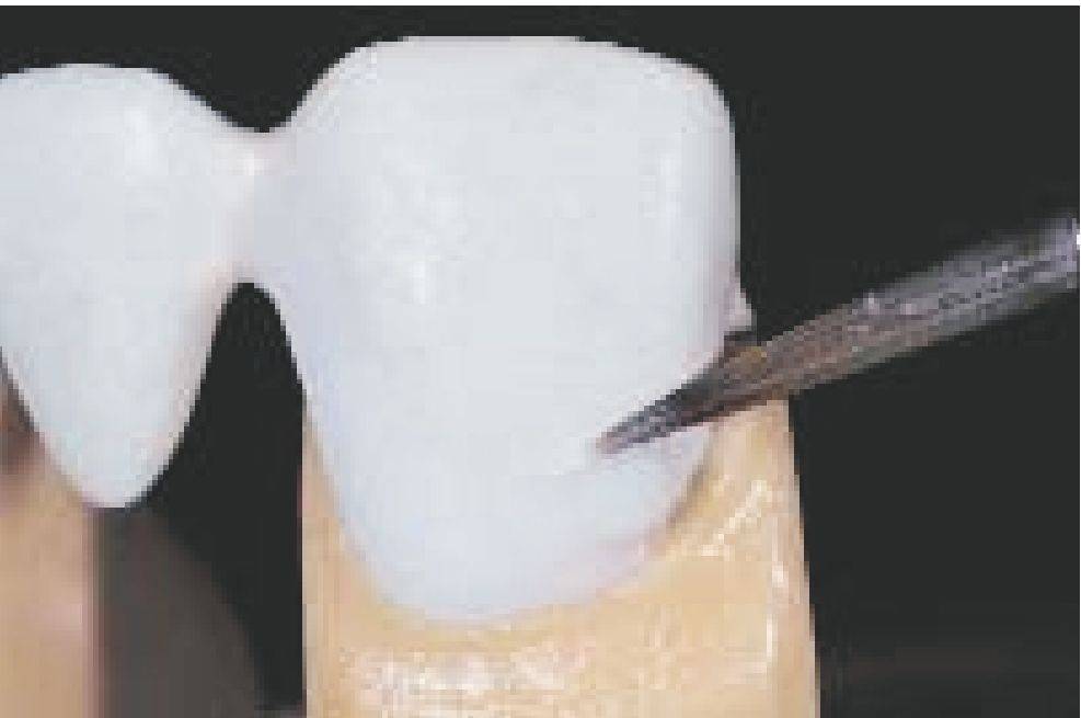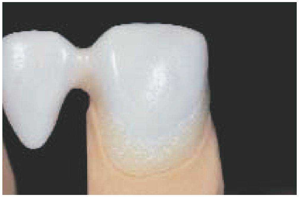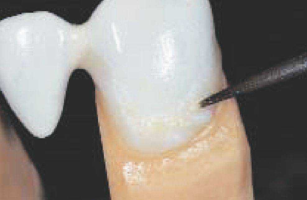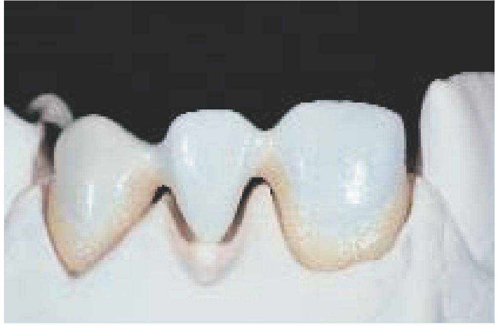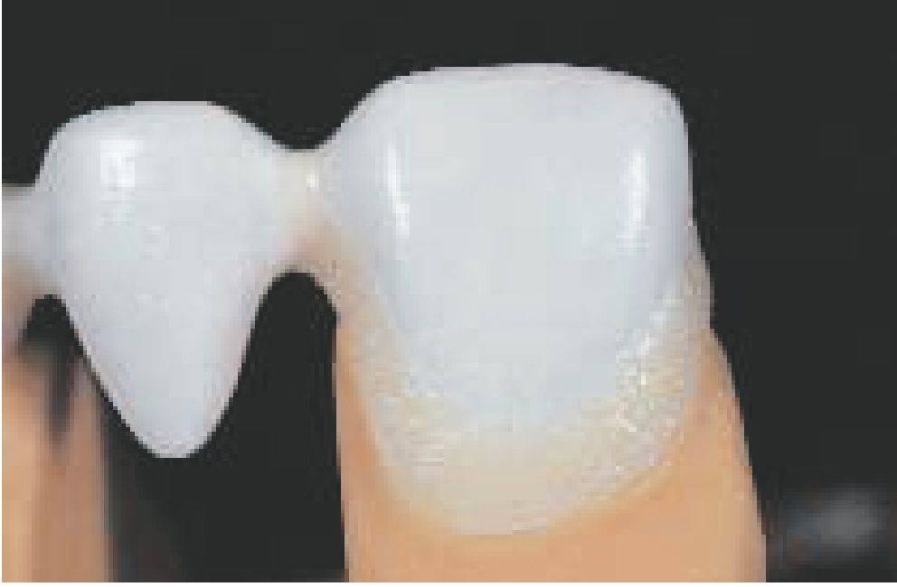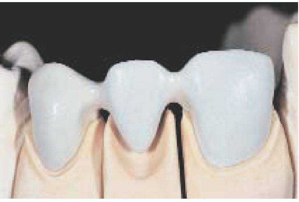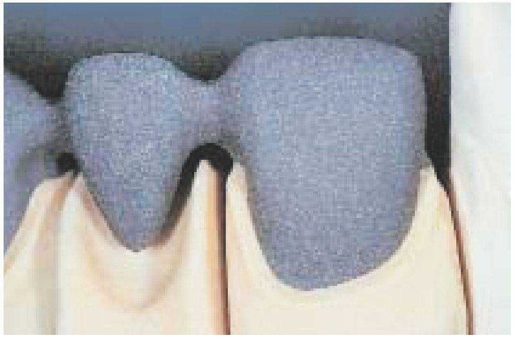 При формировании керамического уступа (особенно у мостовидных протезов) маргинальная масса в интераппроксимальной области может быть несколько завышена, это помогает бороться с интердентальной.