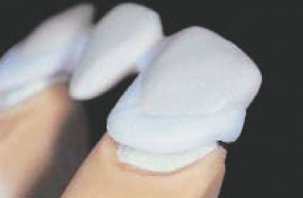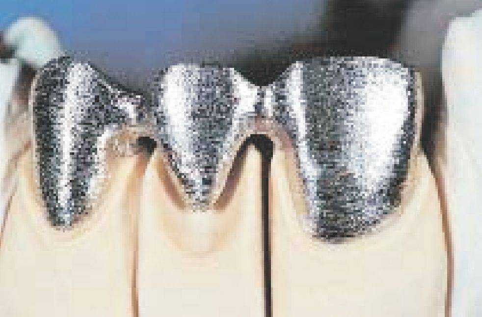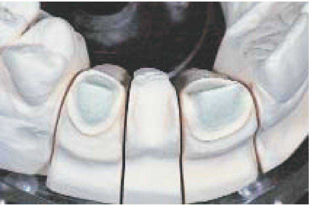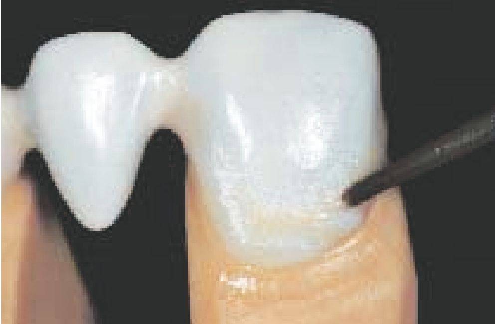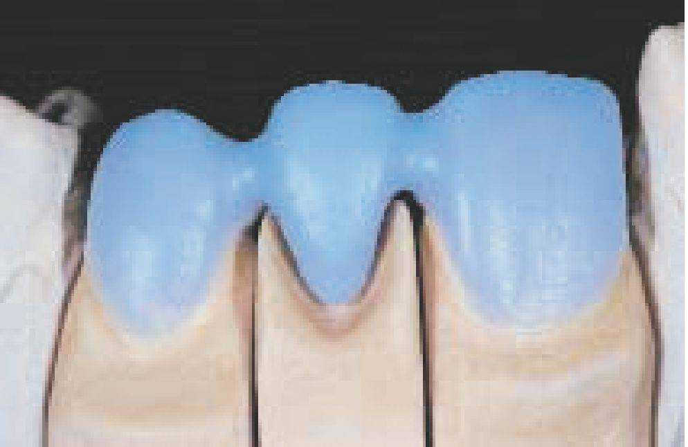 Второй слой опакера наносить таким образом, чтобы металлический каркас был полностью покрыт опакером, то есть брать опакера так много, насколько это необходимо, и в то же время как можно меньше. Для индивидуальных ситуаций, когда к реставрации предъявляются высокие эстетические требования, существуют пять уже замешанных, готовых к работе, пастообразных интенсивных опакера. Интенсивный опакер наносится перед вторым обжигом опакера, туда, где это необходимо (например, в цервикальной, инцизальной, оккпюзальной или палатинальной области).