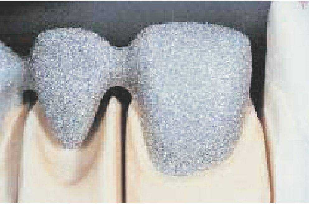 Каркас следует оксидировать в соответствии с заданными параметрами производителя сплава. Каркас хорошо закрепить на трегере - это особенно важно для мостовидных протезов из нескольких единиц. После оксидирования проверить, не появились ли на поверхности пористость или неравномерный оксид, при необходимости провести дополнительную обработку.
