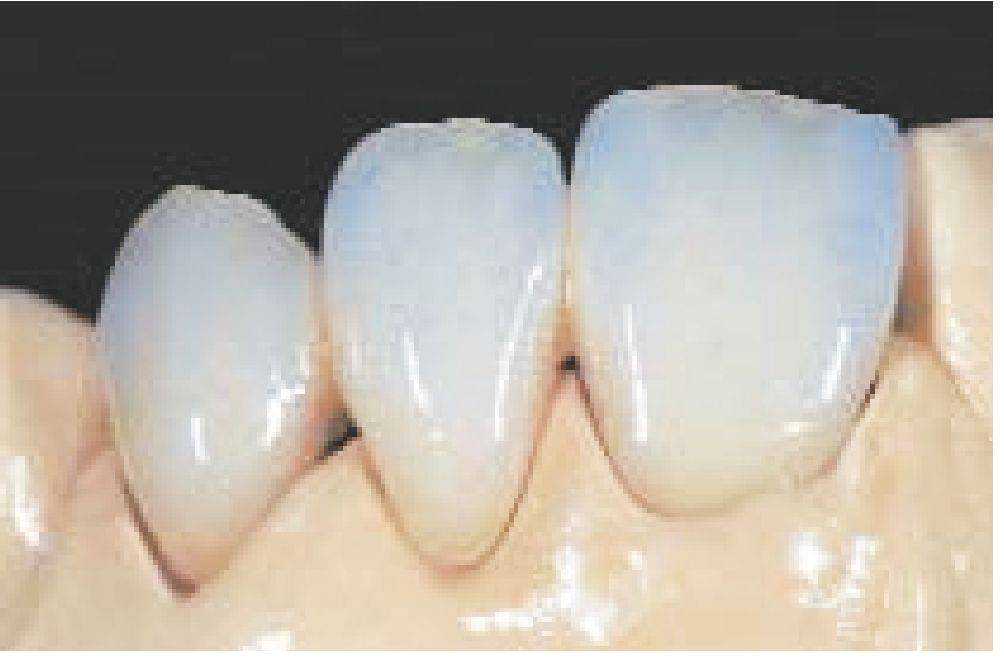 Если при помощи масс IPS d.SIGN необходимо воспроизвести цвета D2 и D3, используется цервикальный дентин D2/D3. Как показано на фотографиях (сверху вниз), сначала цервикальный дентин D2/D3 наносится прямо на опакер. Затем, в зависимости от того цвета, который должен быть воспроизведен, из цветов D2 или D3наслаивается ядро из дентина. Последующий шаг формирование формы зуба с помощью массы режущего края T-S3.