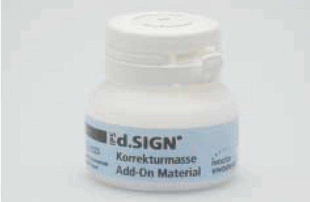 Для корректировки контактных пунктов или PonticAuflagen, необходимость в которой иногда возникает, в Вашем распоряжении имеется специальная низкотемпературная корректировочная масса со средней степенью замутненности IPS d.SIGN Add-On. Взависимости от Ваших сложившихся привычек в работе Вы можете работать с корректировочной массой IPS d.SIGN Add-on разными способами.