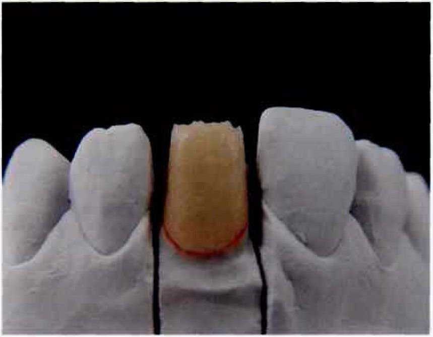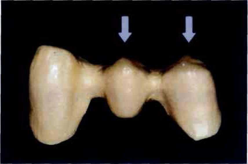 в пришеечных областях промежуточных зубов мостовидных протезов, где дентин имеет меньшую толщину, чем в центральной части, в результате чего он становится слишком прозрачным;.
