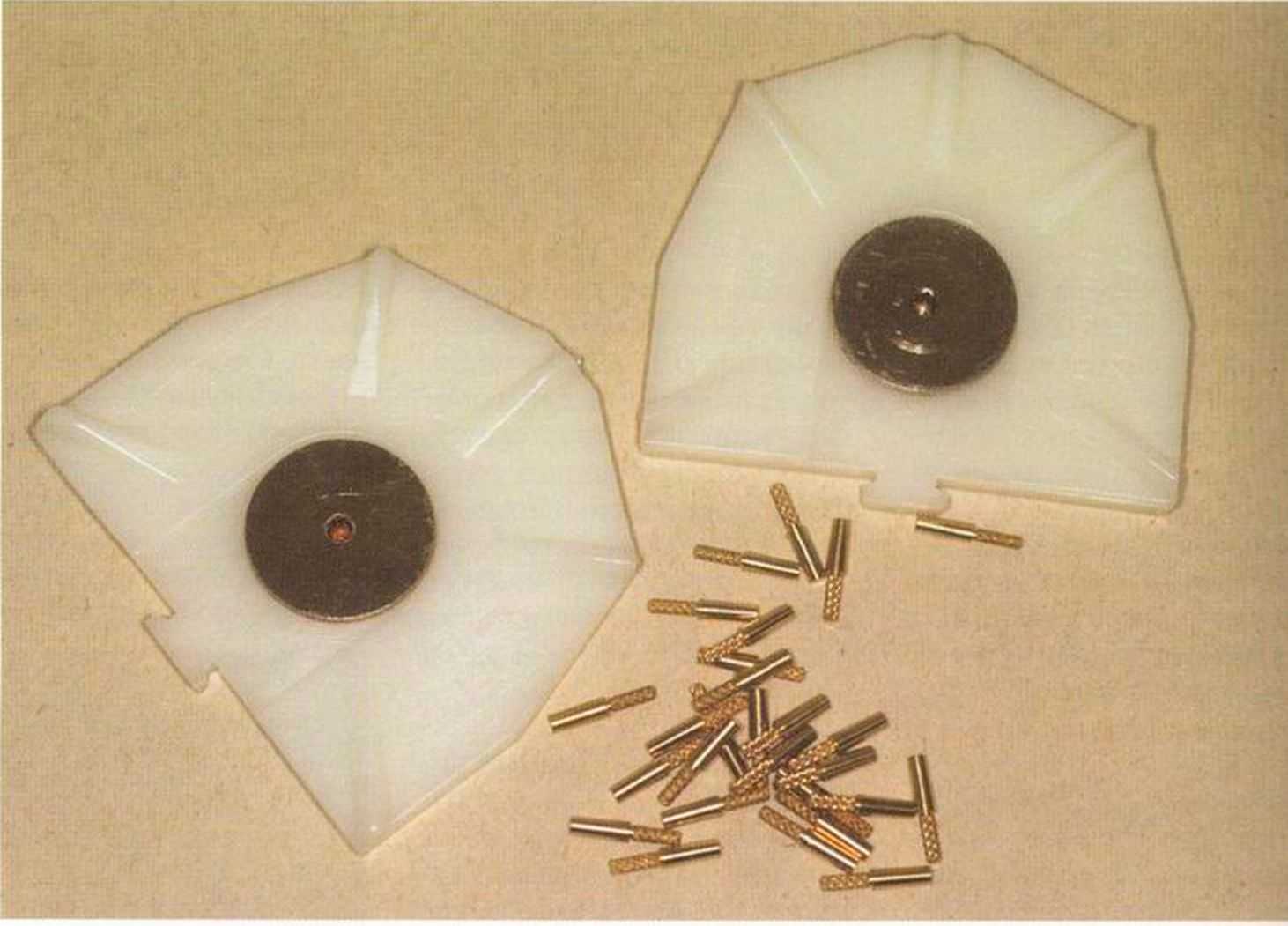 После окончательного высверливания в плату вставляем штифты. Я придавливаю их кончиками пальцев. Некоторые мои коллеги переворачивают плату таким образом, чтобы штифты касались поверхности стола и придавливают ее. Этот метод часто приводит к большой ретенции штифтов в пластиковой плате и раздражает при работе. Также нежелательна подвижность штифтов, так как в этом случае штампики или блоки штампиков при шлифовании могут выпадать.