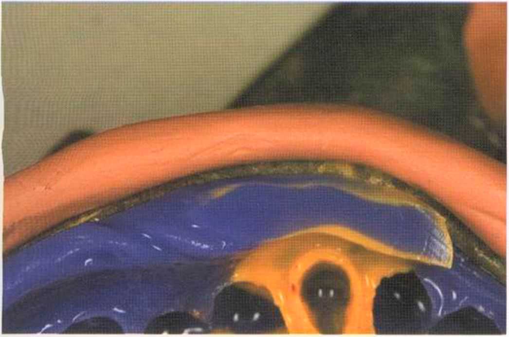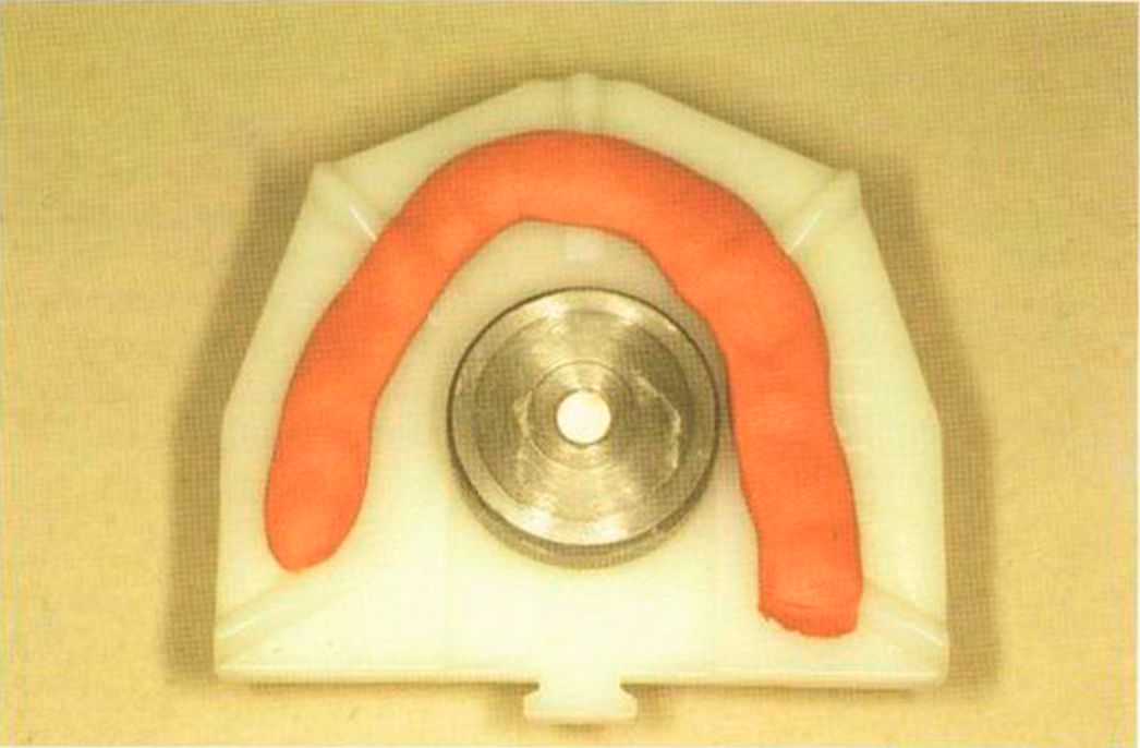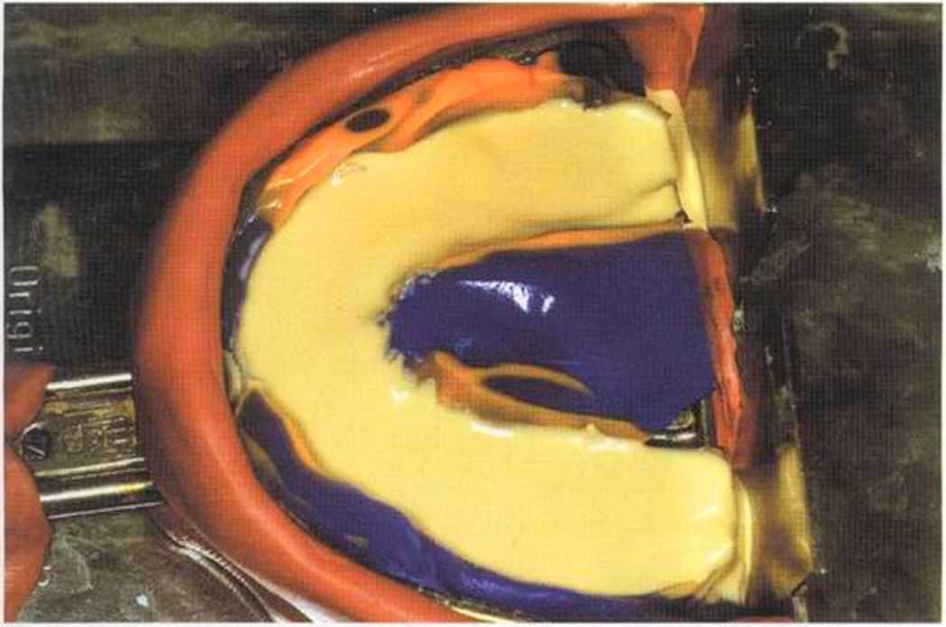 Силиконовый валик, который, с одной стороны, предотвращает вытекание гипса, а с другой, служит опорой для 1ъаты, не должен касаться оттискного материала и деформировать оттиск. В противном случае возникнет искажение, и изготовленная работа не будет припасована в полости рта.