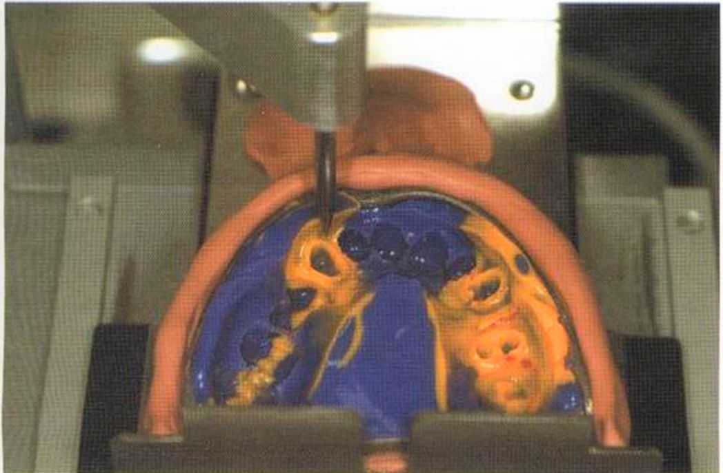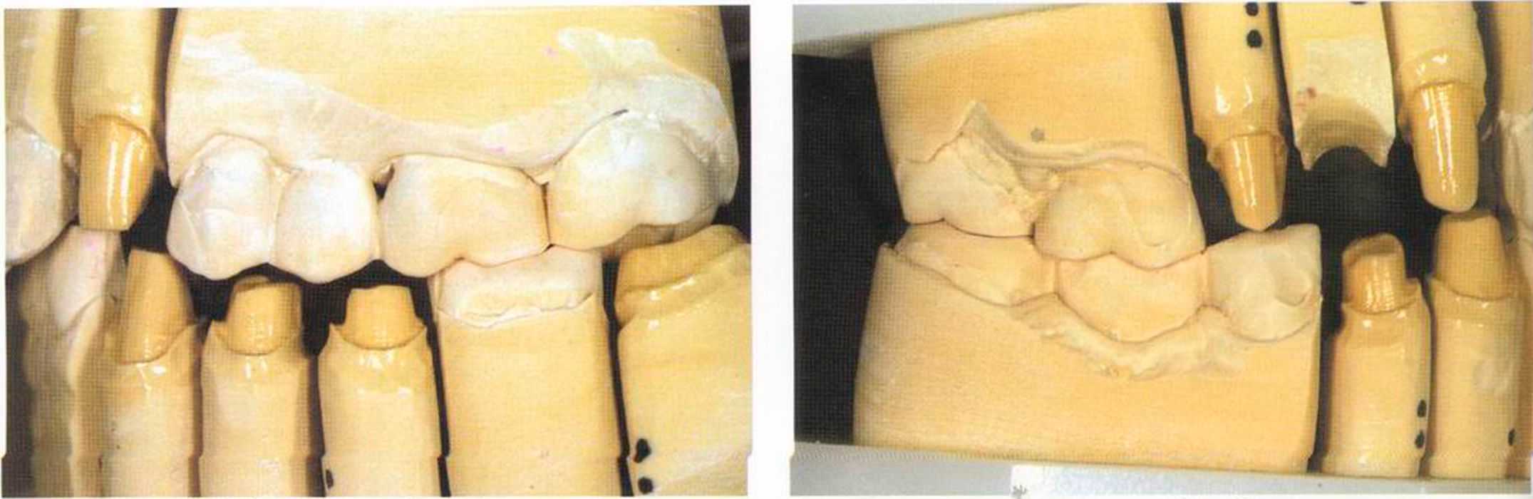 После установки моделей в артикулятор необходимо провести пришлифовывание контактных пунктов. Зубы в полости рта имеют небольшую подвижность за счет шарпеевских волокон. А также сосудистые пучки, расположенные в апикальной части зуба, отвечают за «податливость» парадонта. Это имеет значение при использовании разных систем снятия оттисков.