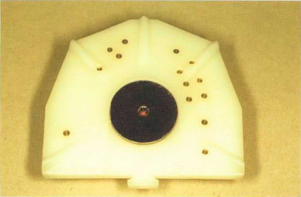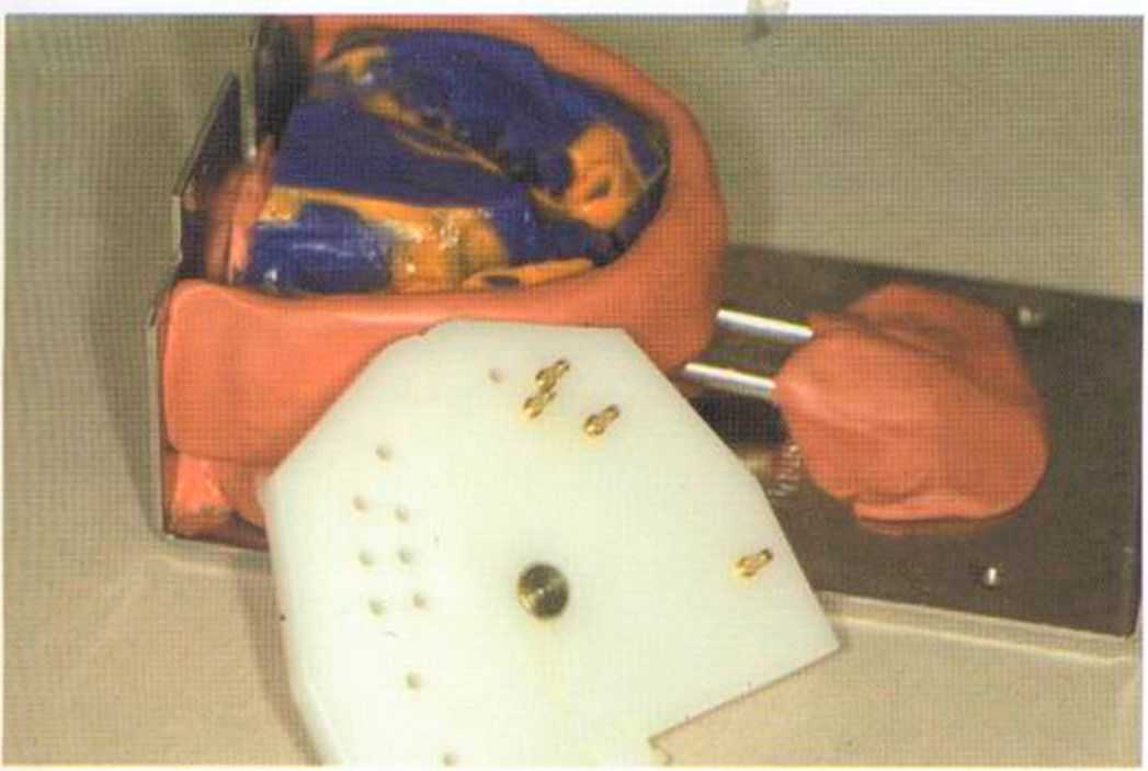 На обратной стороне платы видны просверленные отверстия. Перед тем, как установить платы в артикулятор, эти места необходимо заизолировать силиконовой массой, так как потом между цокольным гипсом и платой может возникнуть зазор. Это особенно важно для дальнейшей точной установки штампиков. Часто случается, что маленькие крошки гипса попадают в этот промежуток, что приводит к возникновению неточностей. Более того, это сильно нервирует.