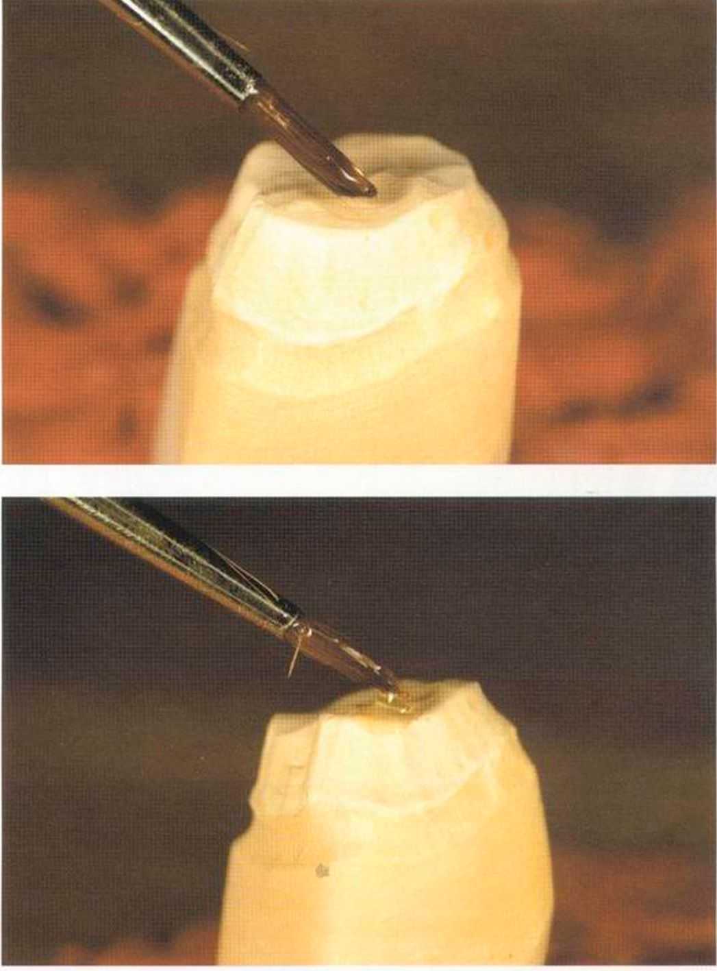 Хороший гипс сам по себе очень твердый и стабилен по краям. Однако лучше, если штампик будет дополнительно упрочнен. Я использую для этого светоотверждаемый штумпфлак, с помощью которого в то же время можно закрыть поднутрения. Он образует место для цемента.