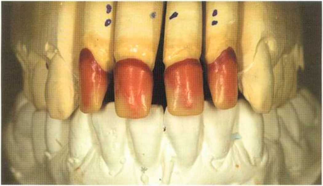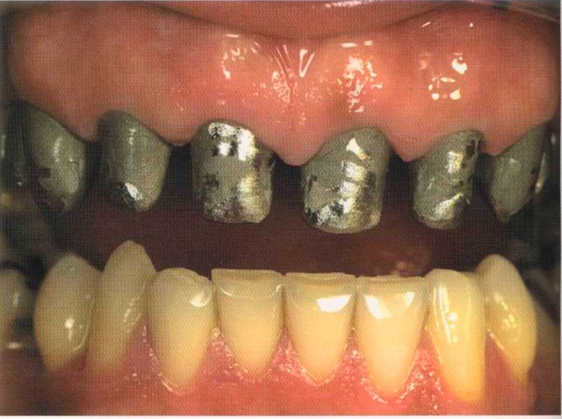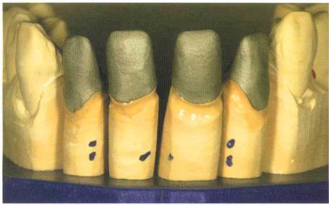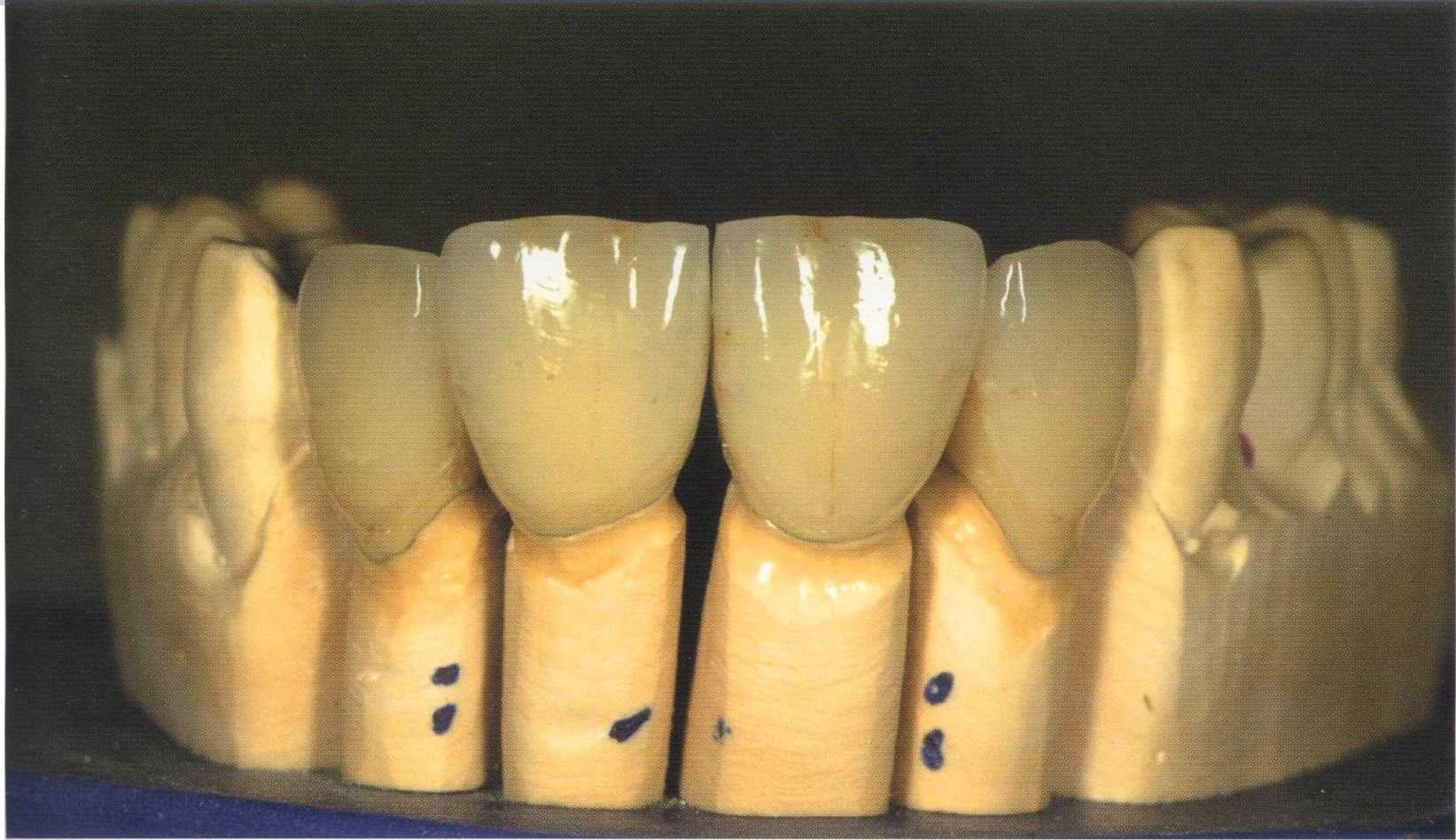Бывают ситуации, как показано на следующих примерах, когда невозможно использовать оба выше названных материала из-за высокой стоимости. Я придерживаюсь мнения, что недопустимо на «дешевом» материале изготавливать плохие облицовки. Образование окисной пленки на неблагородных сплавах готовит нас к определенным, заранее известным нам трудностям при изготовлении облицовок. Но небольшие хитрости помогают справиться с этими проблемами. И керамическая работа получается не хуже, чем на сплаве с высоким содержанием золота или на безметалловом каркасе. Свою концепцию послойного нанесения керамики я представляю в одной главе.