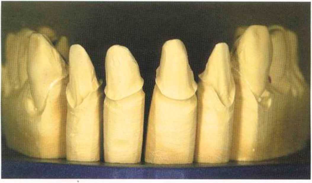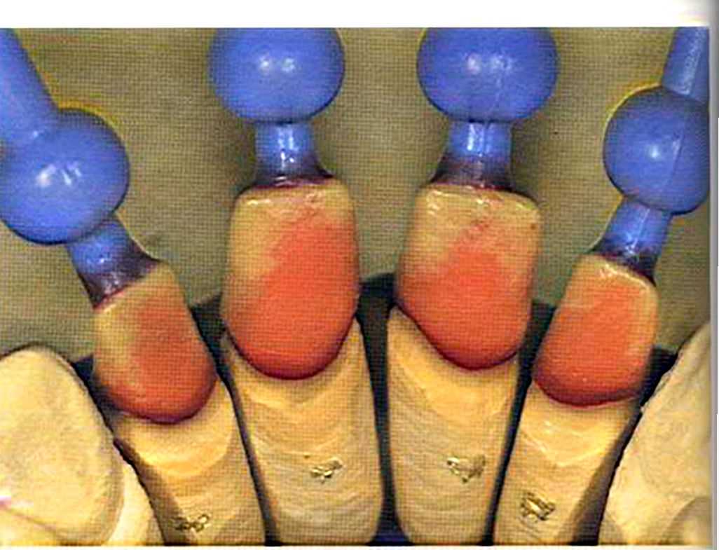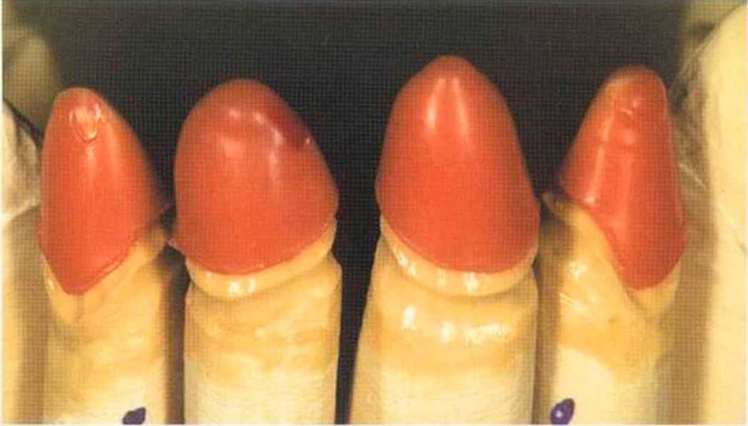 Справа и внизу: используем методику погружения в воск, оправдавшую себя на деле при изготовлении золотых колпачков. Здесь мы видим укороченные колпачки из воска ELASTODIP фирмы YETIDENTAL.