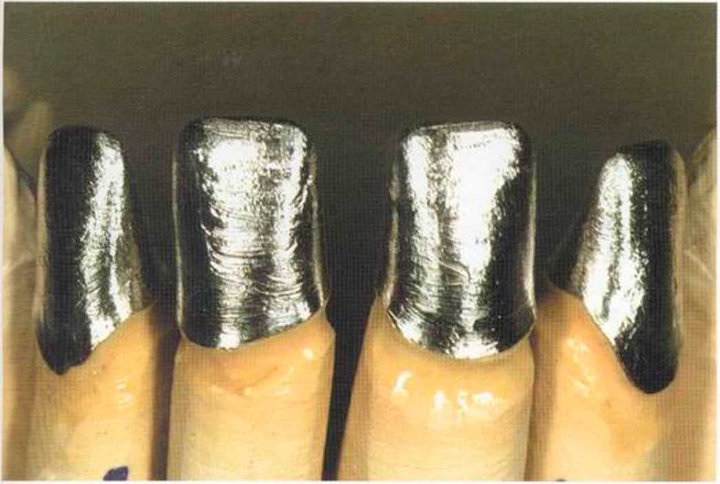 Пескоструйную обработку неблагородных сплавов надо осуществлять в четком соответствии с инструкцией производителя (например, для Ni — Сг сплавов Giulini и Ведо давление — 4 bar, размер частиц — 250). В результате этой обработки края коронки могут стать короче, что не является недостатком, так как у нас появляется возможность закрыть темную окись без выкладывания плеча и достичь максимальной эстетики.