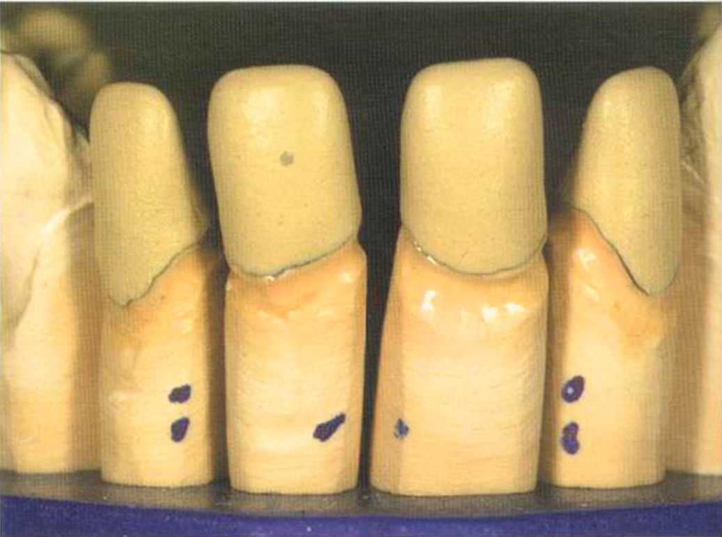 На рабочей модели — отпрепарированные зубы под металлокерамику. Небольшой уступ с небной стороны.