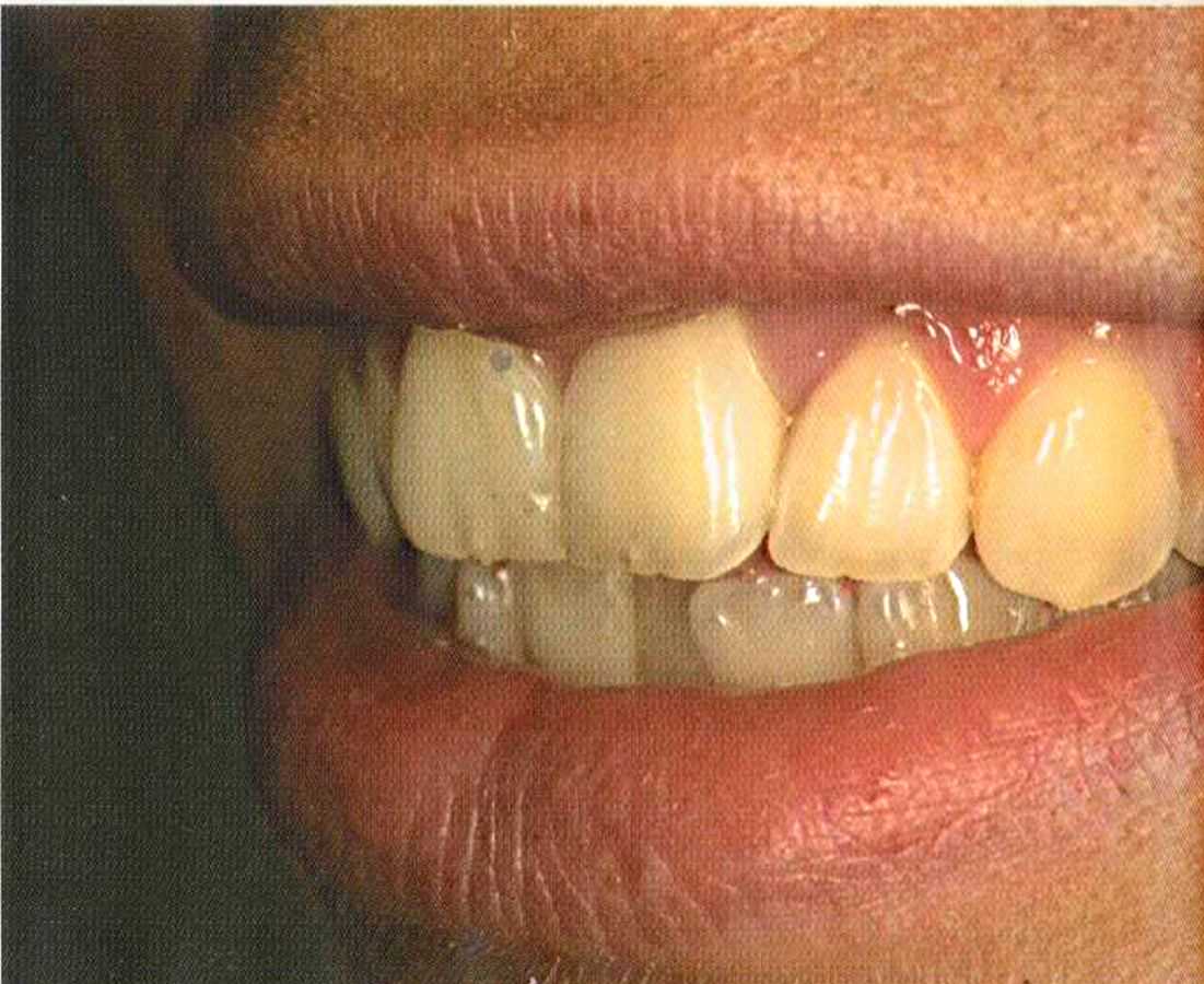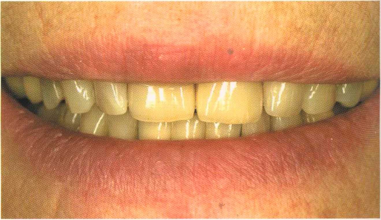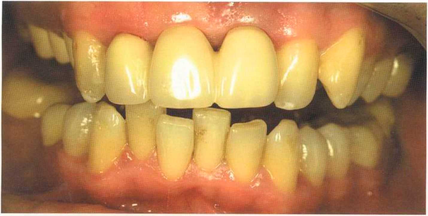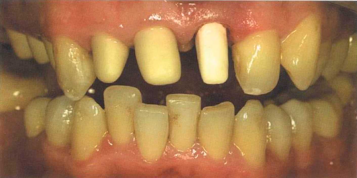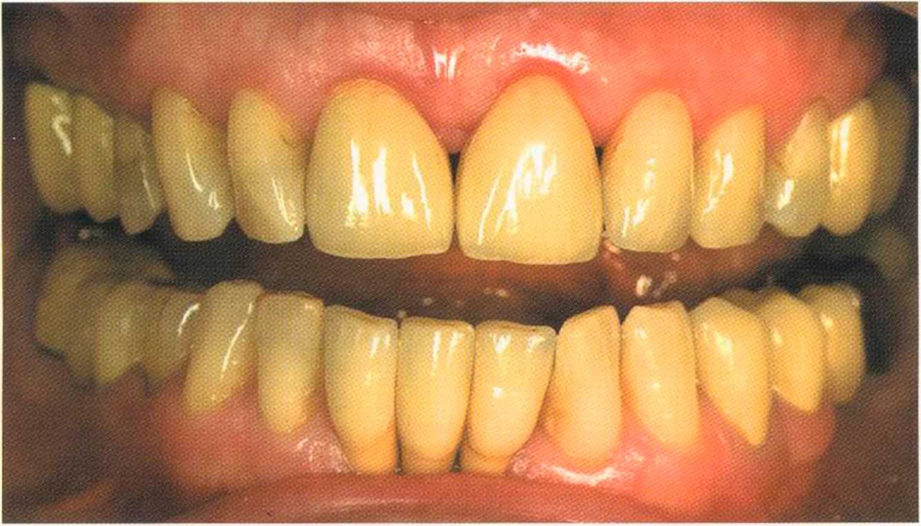 Этот пациент — португалец. Он всю жизнь имел такое положение зубов. Небнорасположенный боковой резец теперь необходимо удалить, а затем воссоздать как эстетику, так и функцию в области фронтальной группы зубов. Планируется изготовить коронки In-Ceram в области 11 и 21 и соединить их вместе из-за увеличивающейся подвижности зубов.
