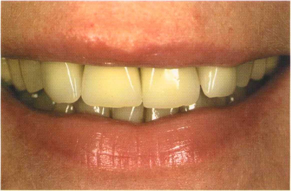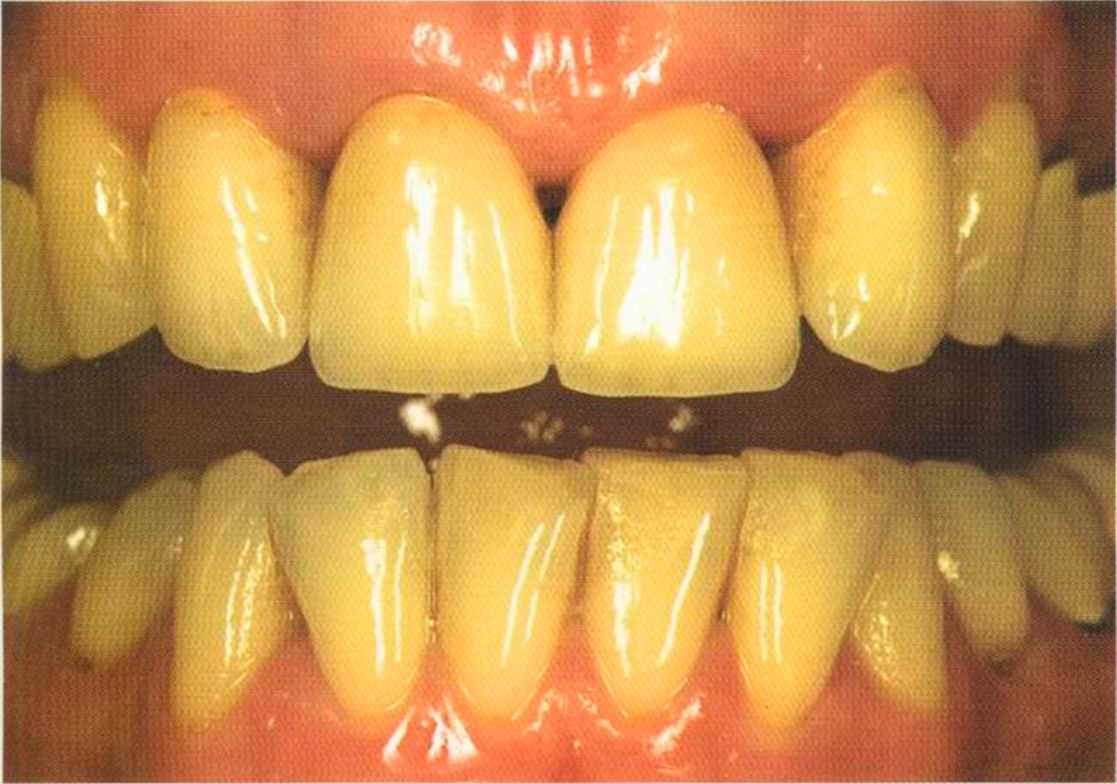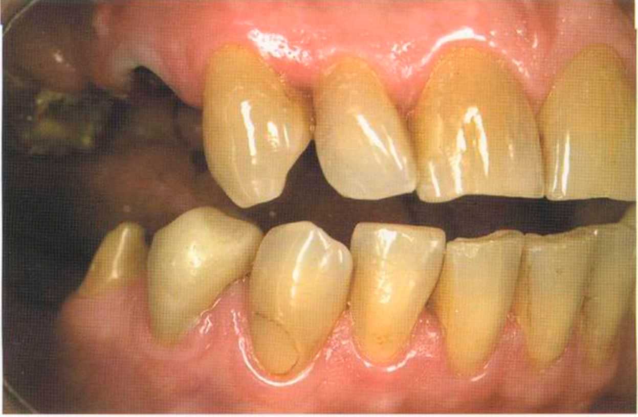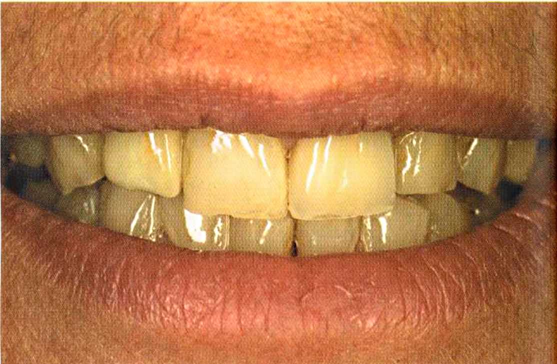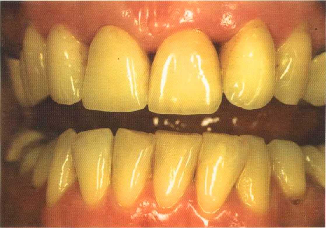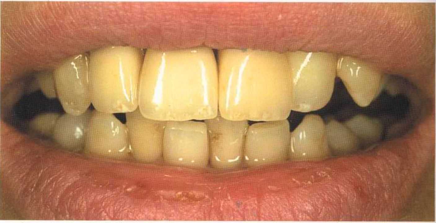 Этот пациент — португалец. Он всю жизнь имел такое положение зубов. Небнорасположенный боковой резец теперь необходимо удалить, а затем воссоздать как эстетику, так и функцию в области фронтальной группы зубов. Планируется изготовить коронки In-Ceram в области 11 и 21 и соединить их вместе из-за увеличивающейся подвижности зубов.