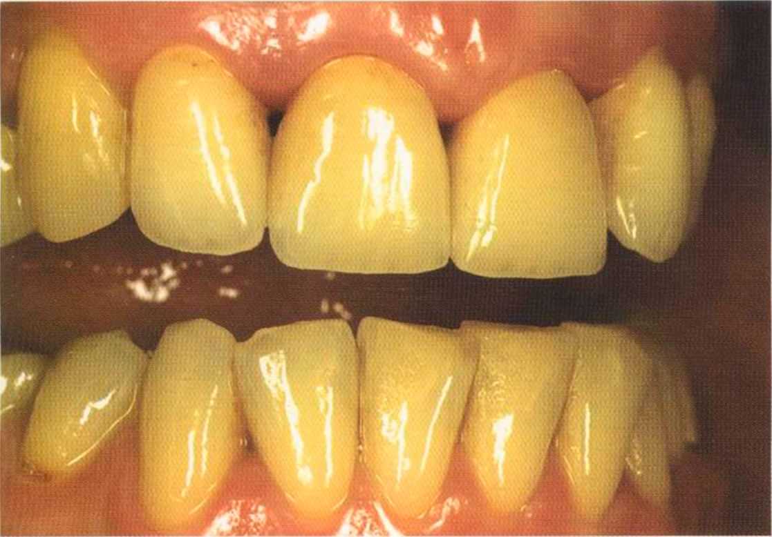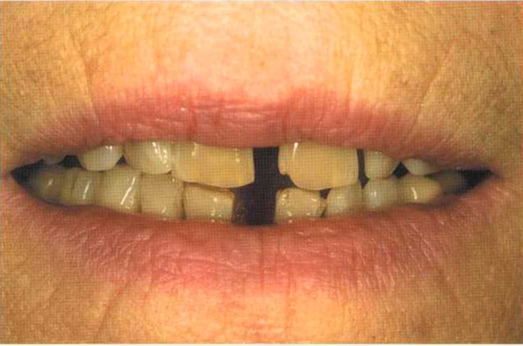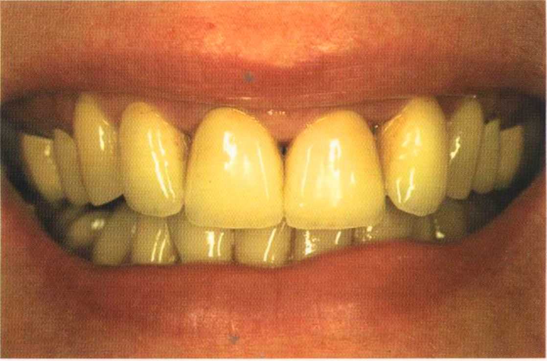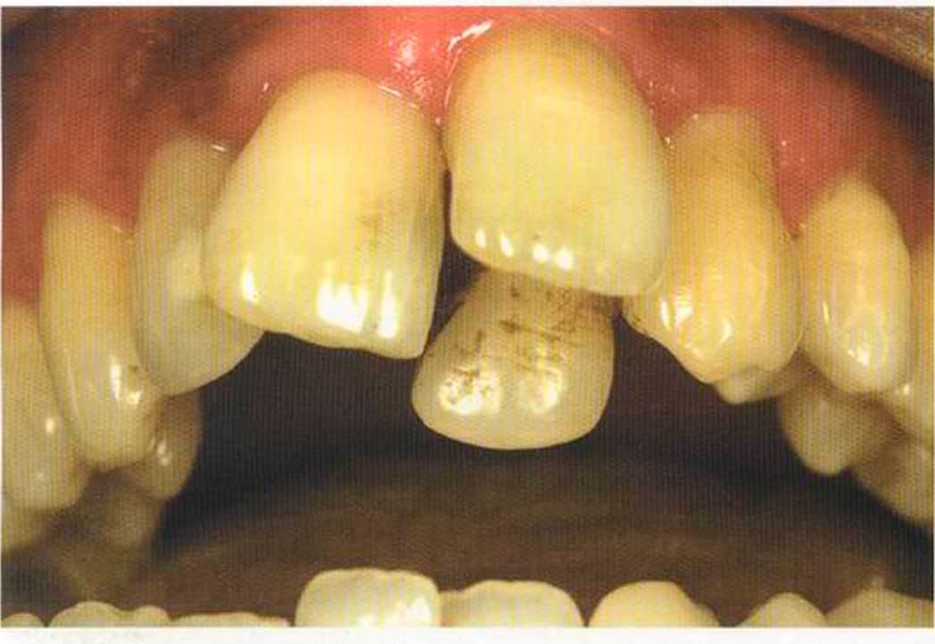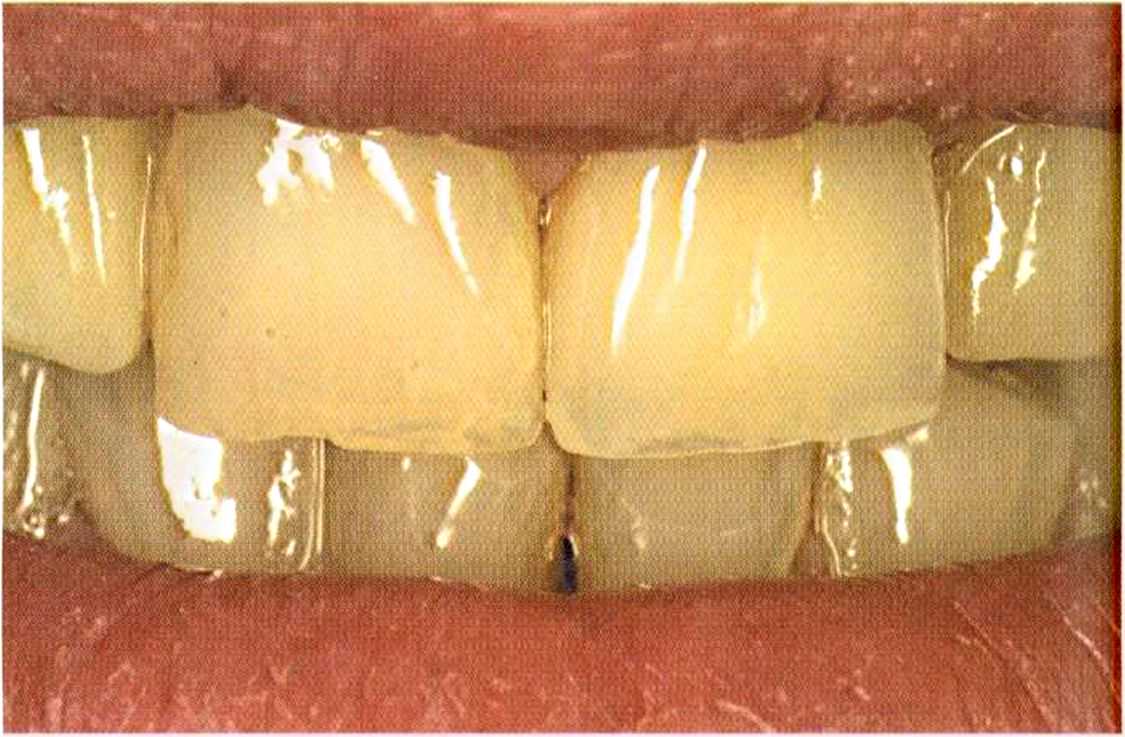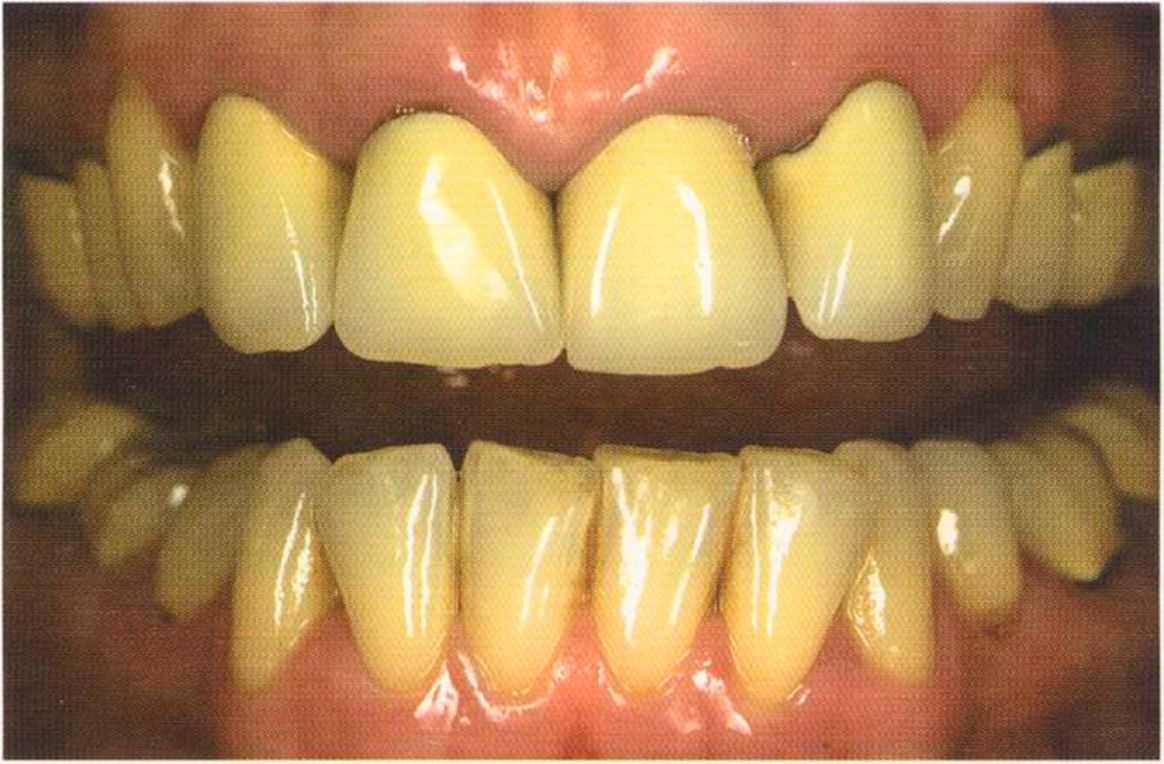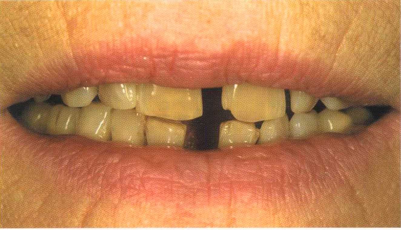 Этот пациент — португалец. Он всю жизнь имел такое положение зубов. Небнорасположенный боковой резец теперь необходимо удалить, а затем воссоздать как эстетику, так и функцию в области фронтальной группы зубов. Планируется изготовить коронки In-Ceram в области 11 и 21 и соединить их вместе из-за увеличивающейся подвижности зубов.