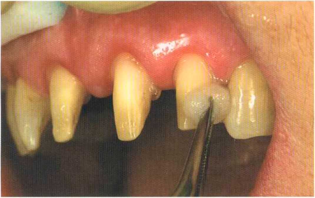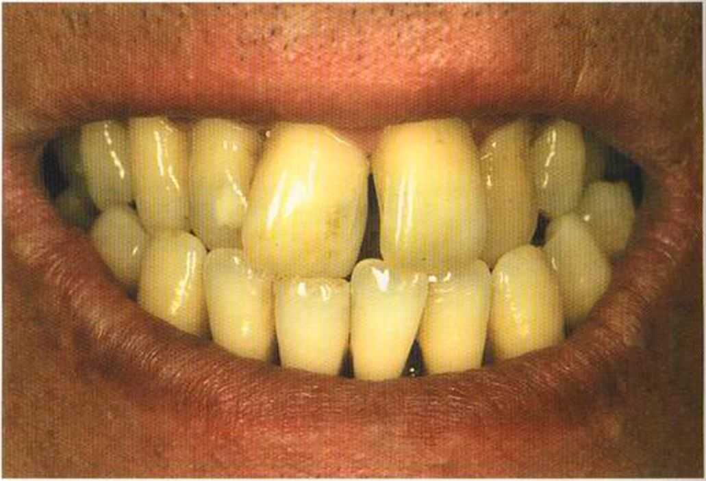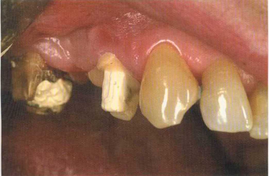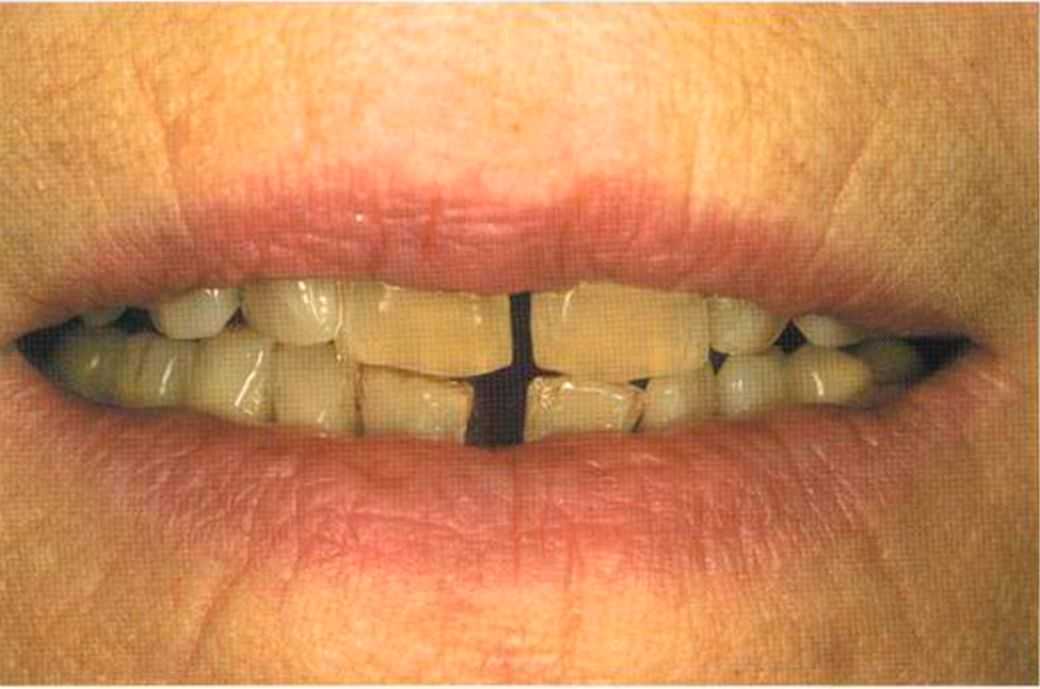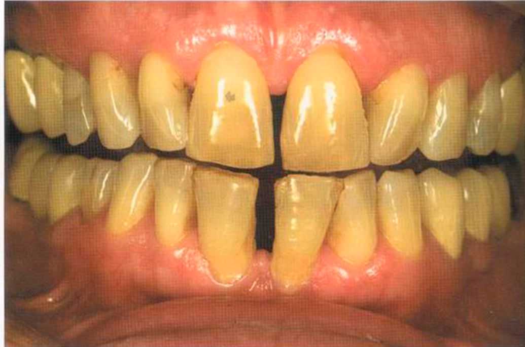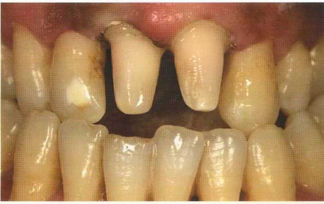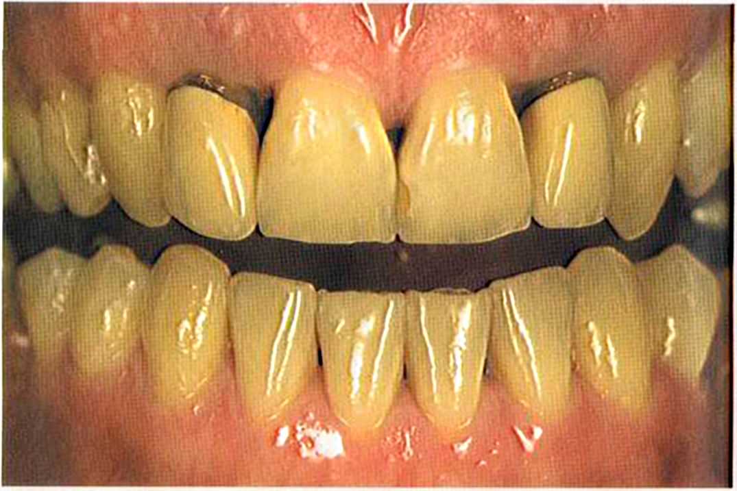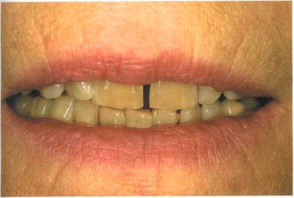 Этот пациент — португалец. Он всю жизнь имел такое положение зубов. Небнорасположенный боковой резец теперь необходимо удалить, а затем воссоздать как эстетику, так и функцию в области фронтальной группы зубов. Планируется изготовить коронки In-Ceram в области 11 и 21 и соединить их вместе из-за увеличивающейся подвижности зубов.