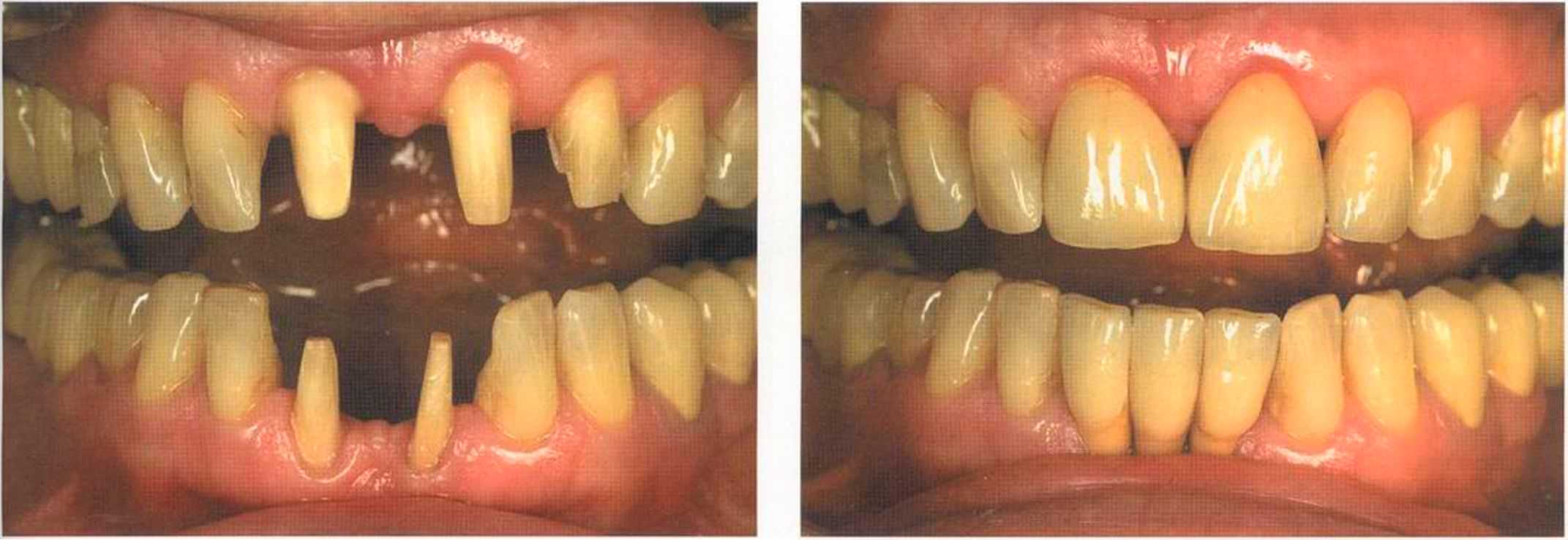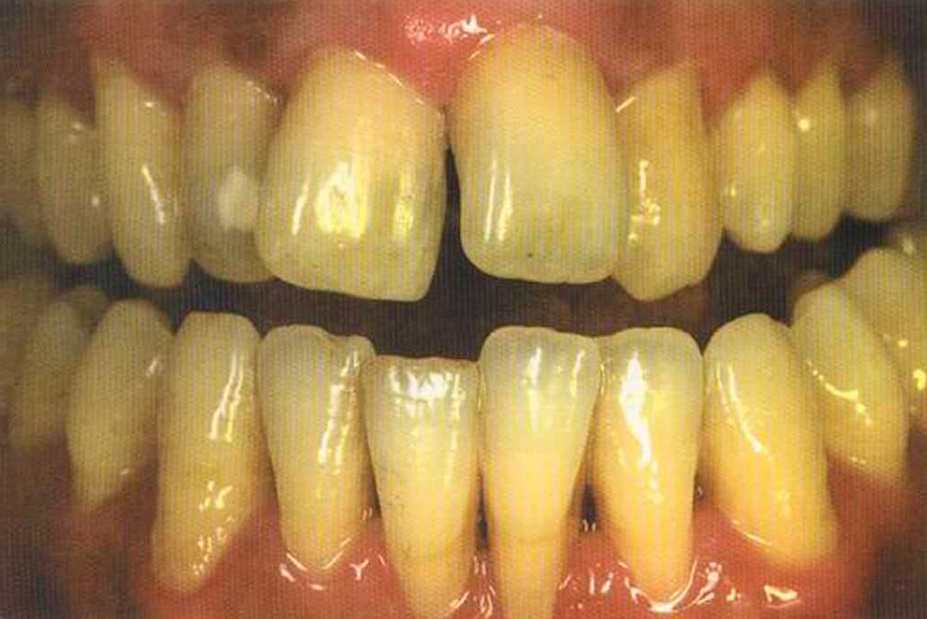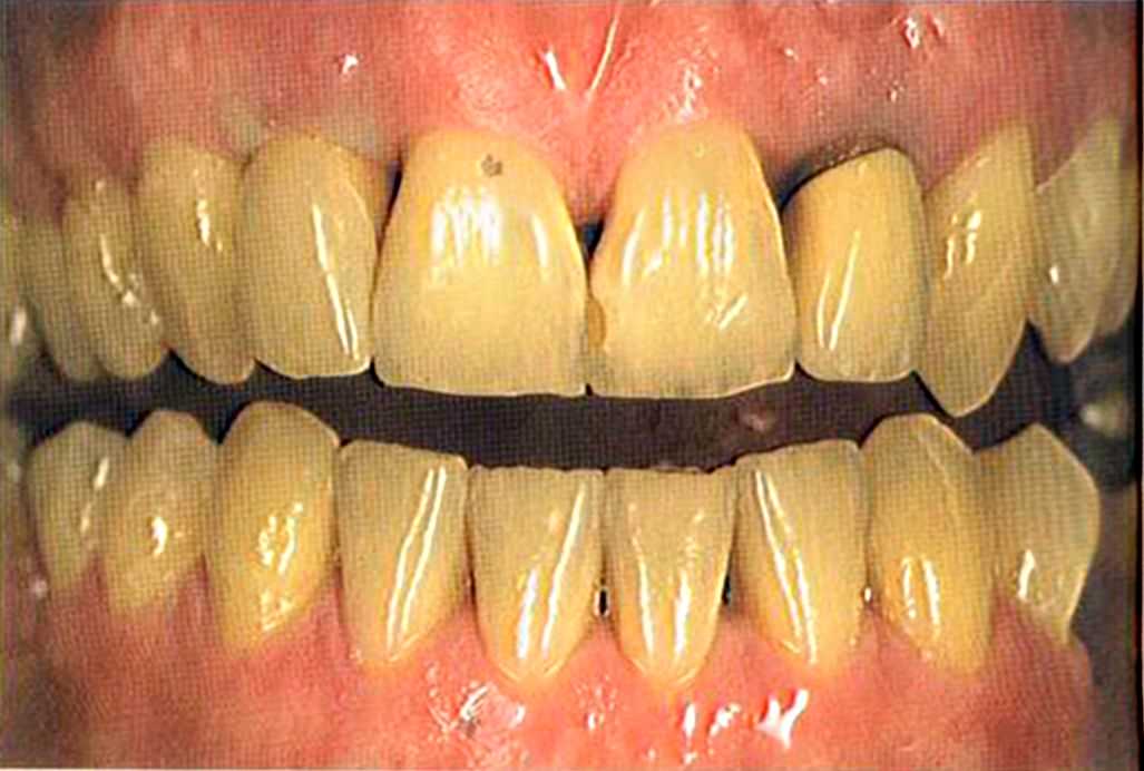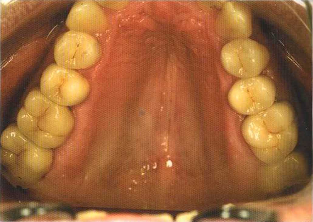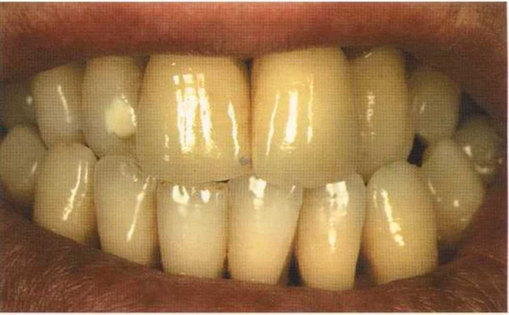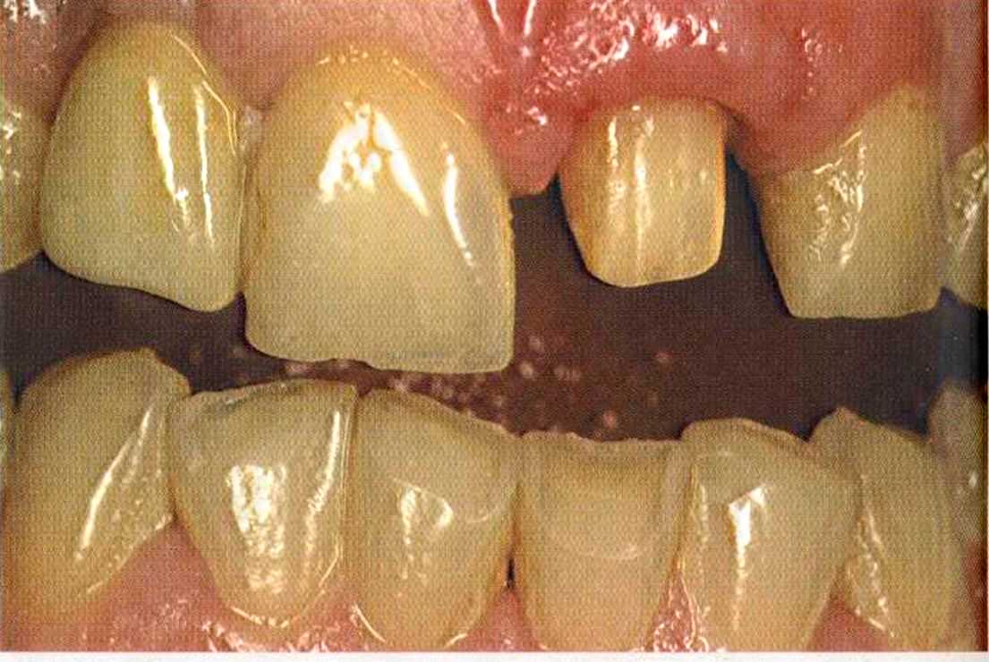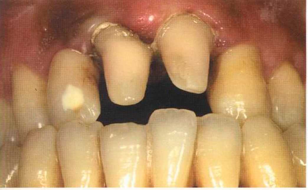 Этот пациент — португалец. Он всю жизнь имел такое положение зубов. Небнорасположенный боковой резец теперь необходимо удалить, а затем воссоздать как эстетику, так и функцию в области фронтальной группы зубов. Планируется изготовить коронки In-Ceram в области 11 и 21 и соединить их вместе из-за увеличивающейся подвижности зубов.