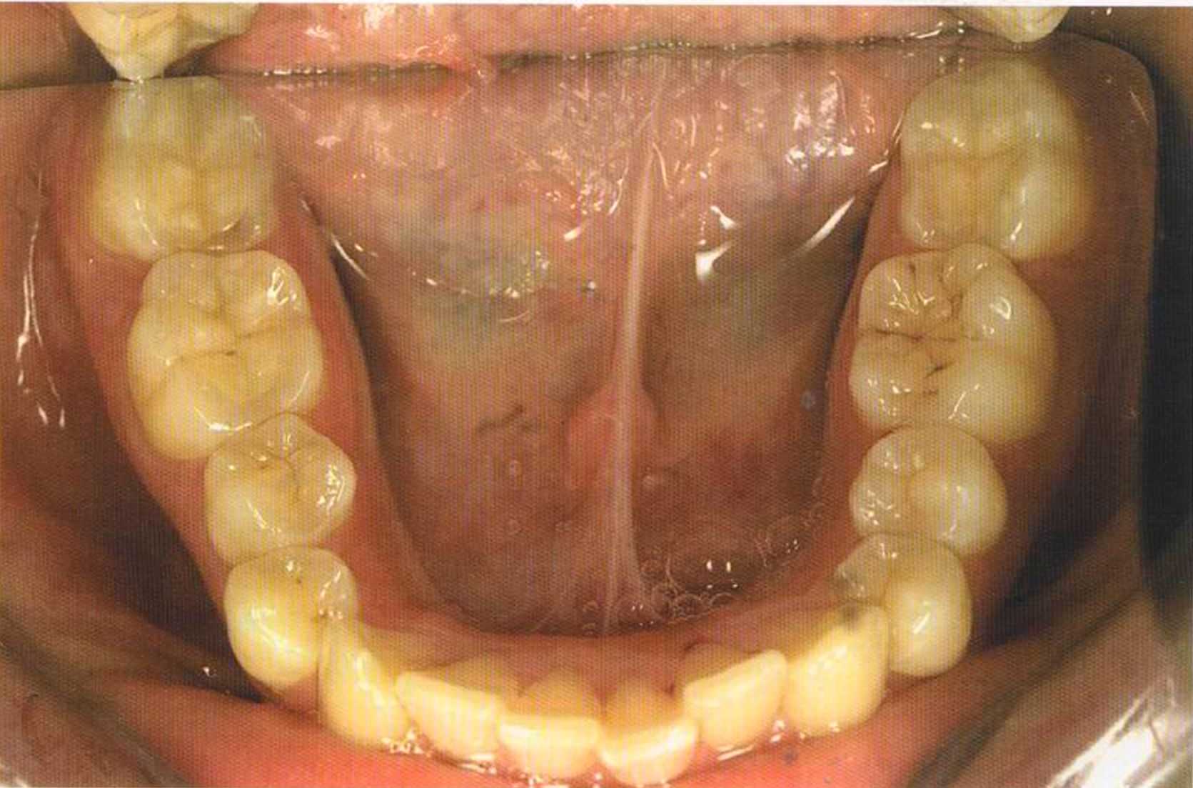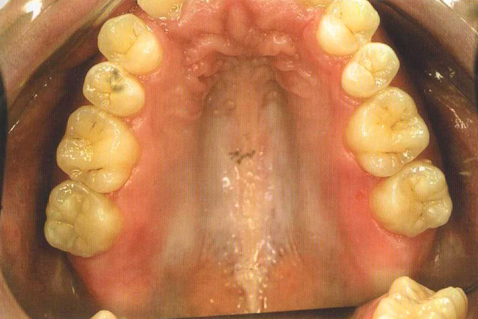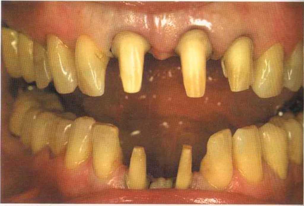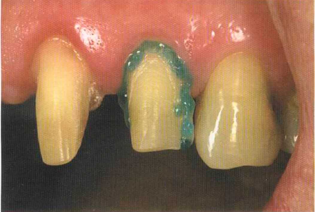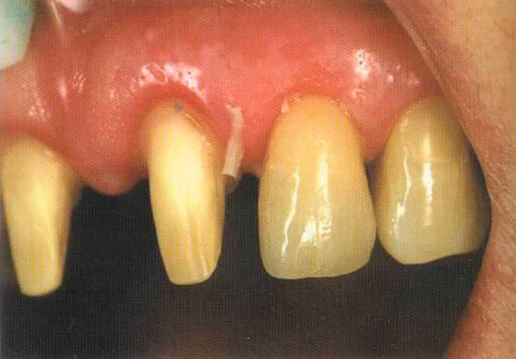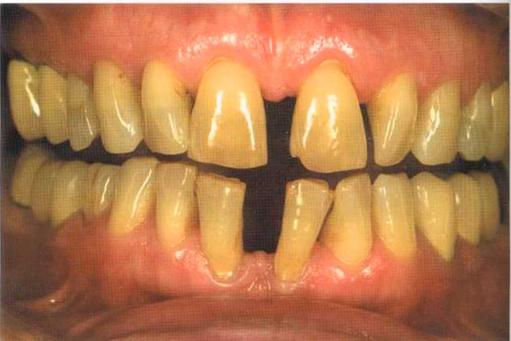 Этот пациент — португалец. Он всю жизнь имел такое положение зубов. Небнорасположенный боковой резец теперь необходимо удалить, а затем воссоздать как эстетику, так и функцию в области фронтальной группы зубов. Планируется изготовить коронки In-Ceram в области 11 и 21 и соединить их вместе из-за увеличивающейся подвижности зубов.