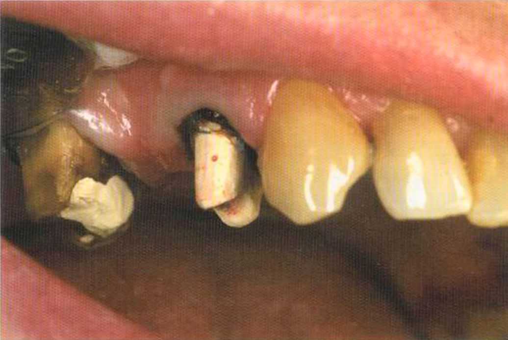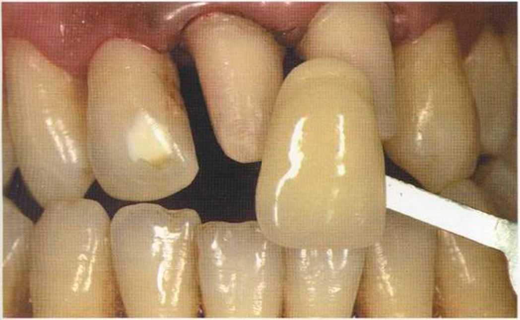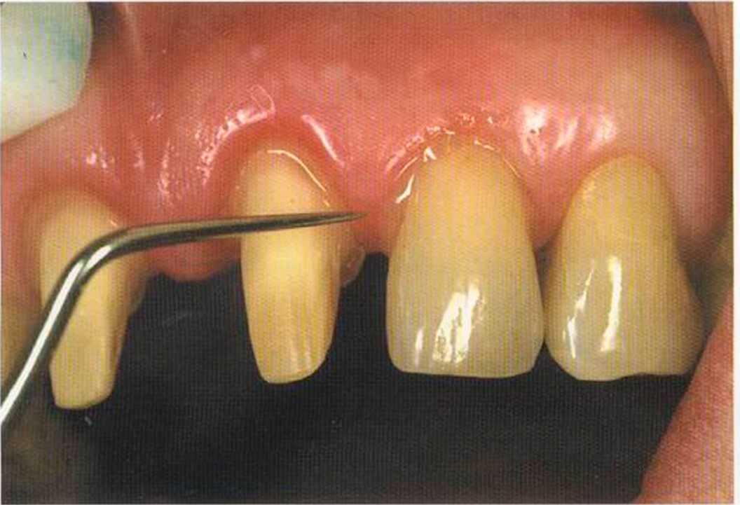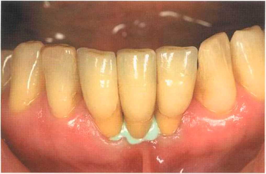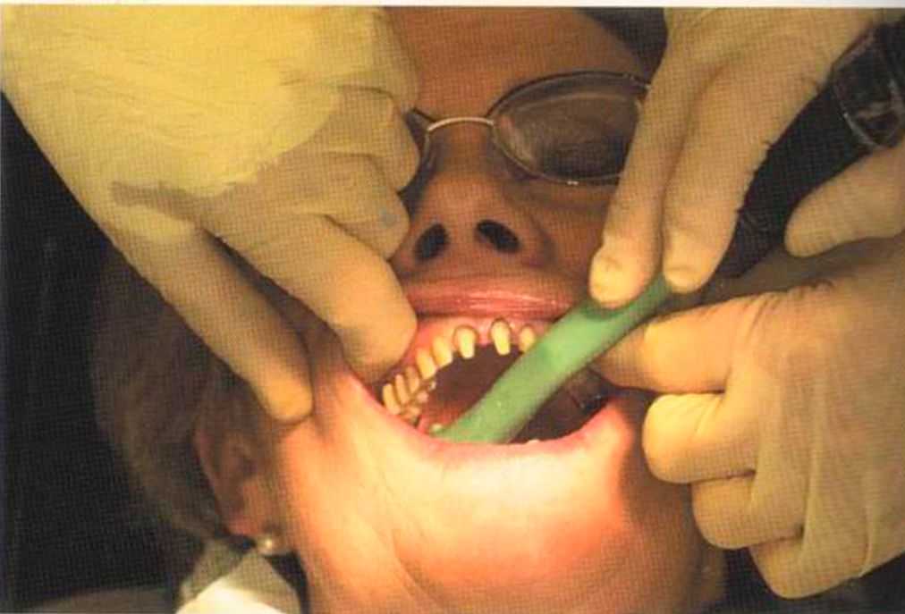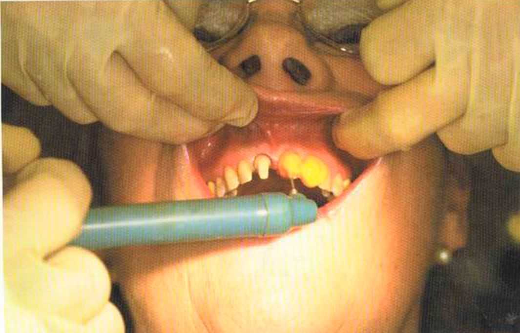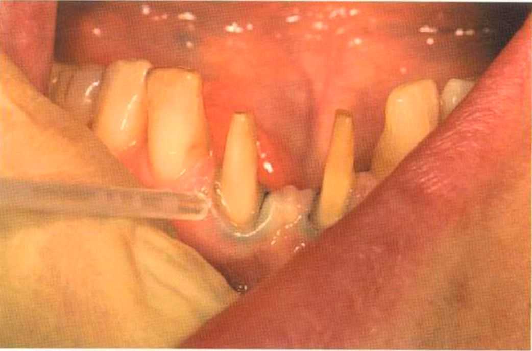 Этот пациент — португалец. Он всю жизнь имел такое положение зубов. Небнорасположенный боковой резец теперь необходимо удалить, а затем воссоздать как эстетику, так и функцию в области фронтальной группы зубов. Планируется изготовить коронки In-Ceram в области 11 и 21 и соединить их вместе из-за увеличивающейся подвижности зубов.